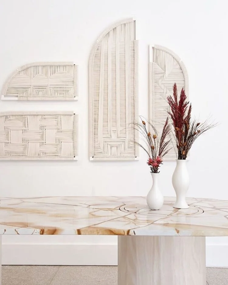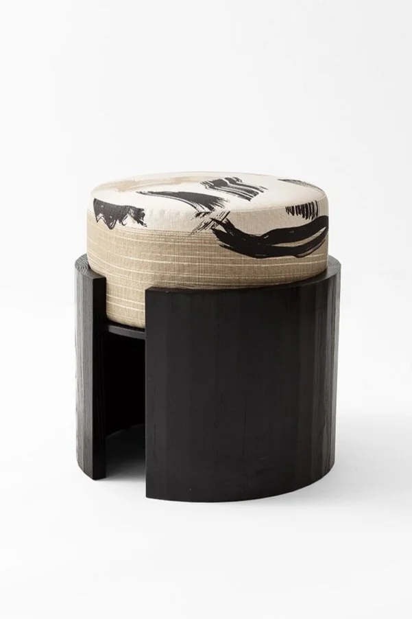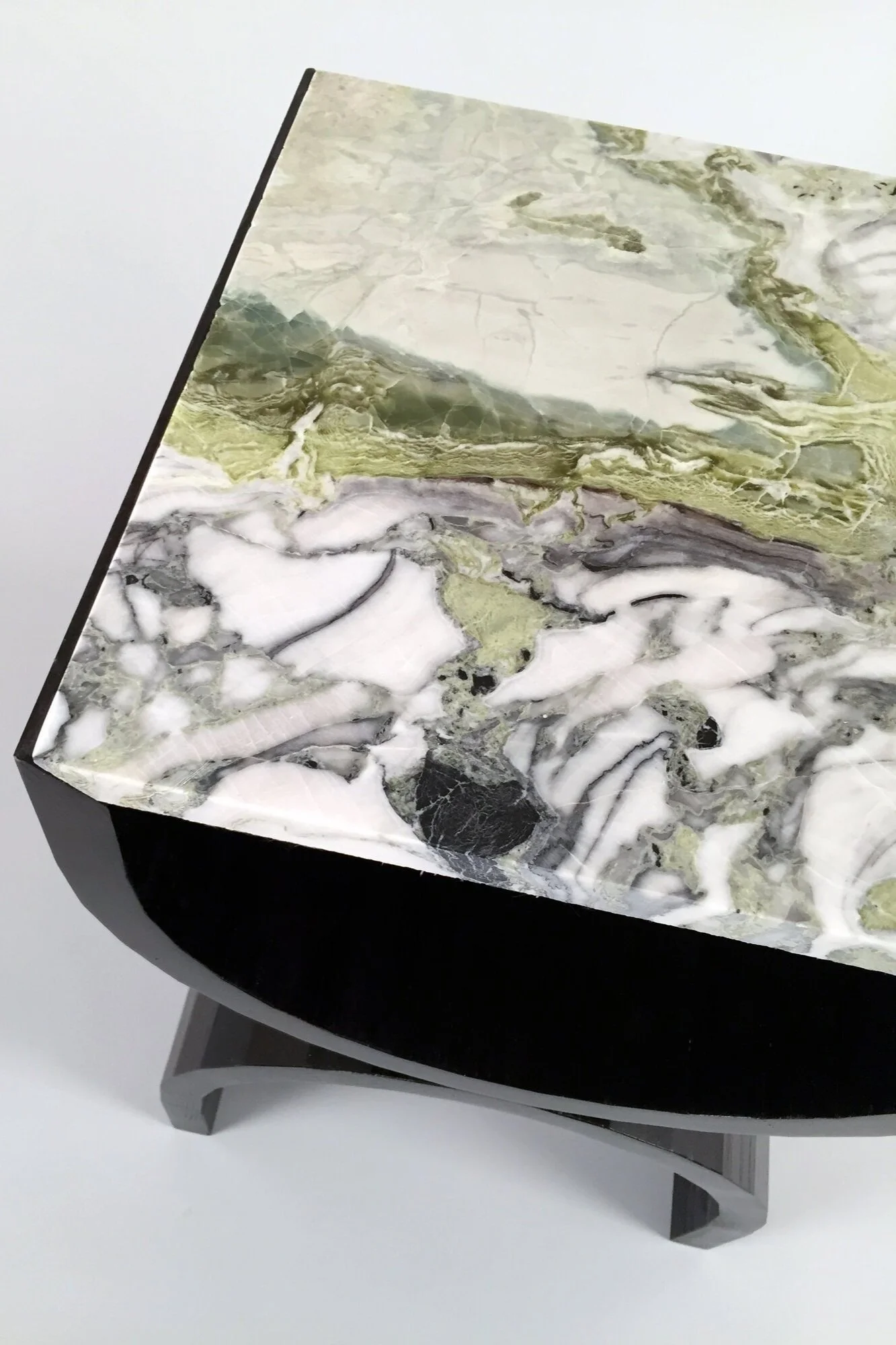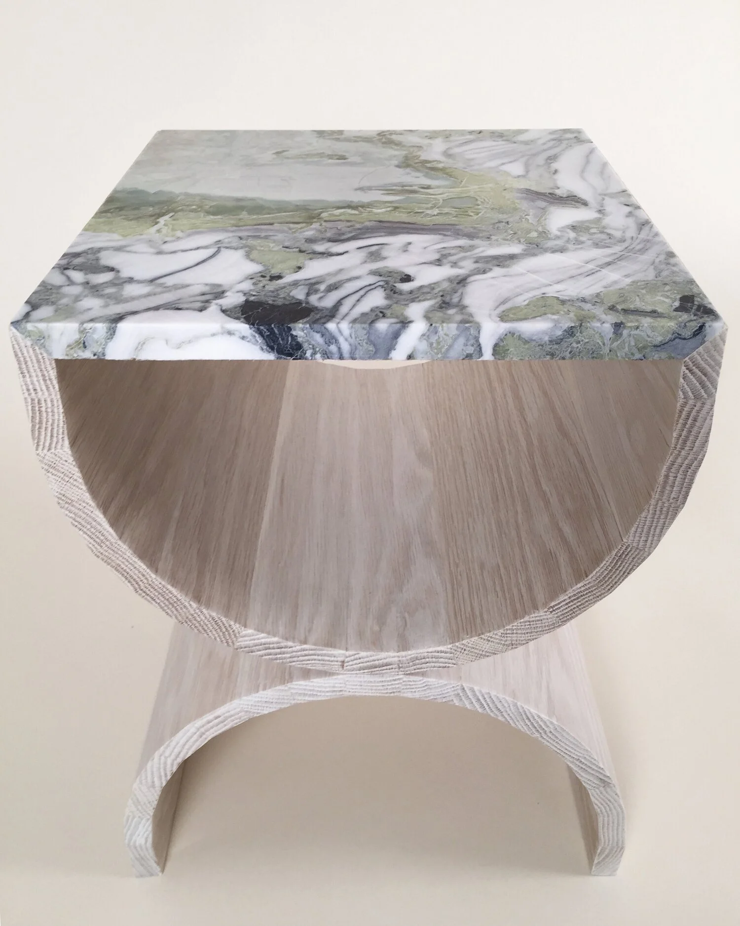 The Bastet series is made from grain matched coopered ash which forms a gently faceted base that cradles the hand-selected marble tabletop or velvet upholstered seat cushion.