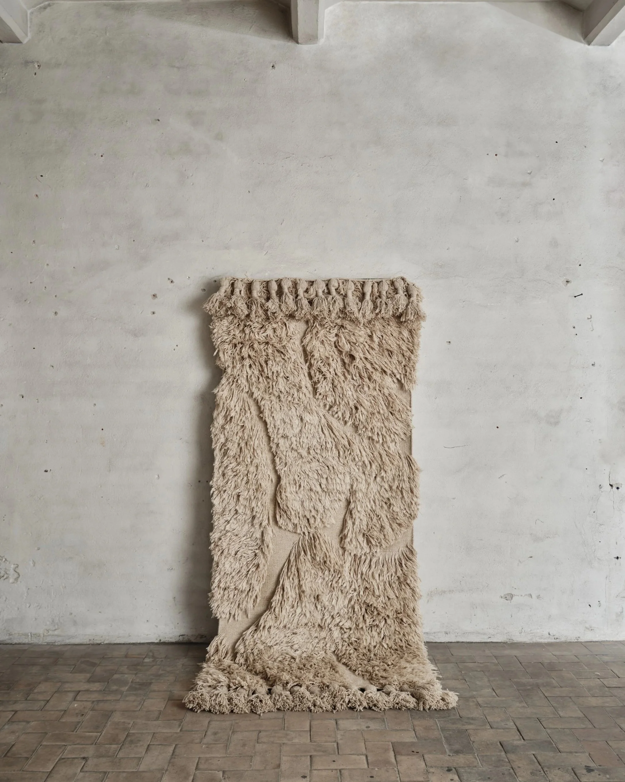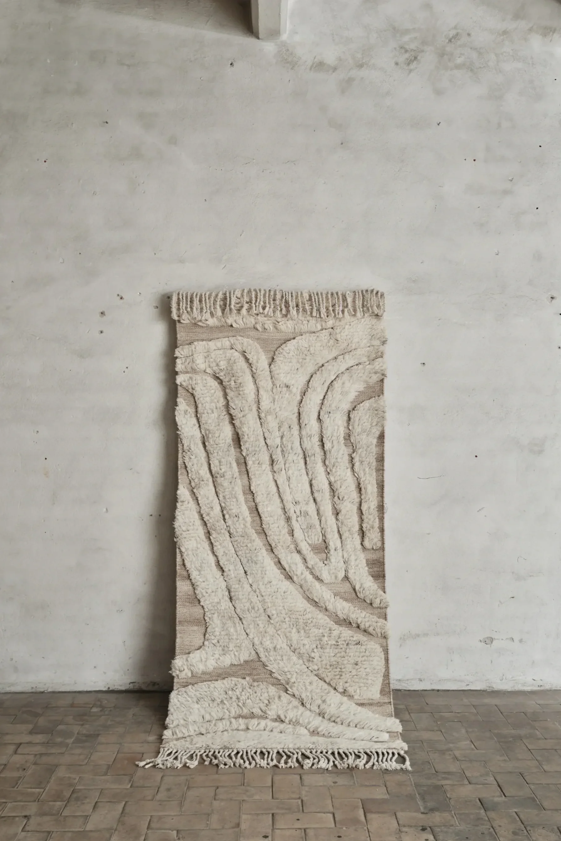 Colonnade no.02 is an homage to the understated bohemian elegance with soft irregular pattern of highs and lows in crème beige shade and decorated with bold chunky tassels.