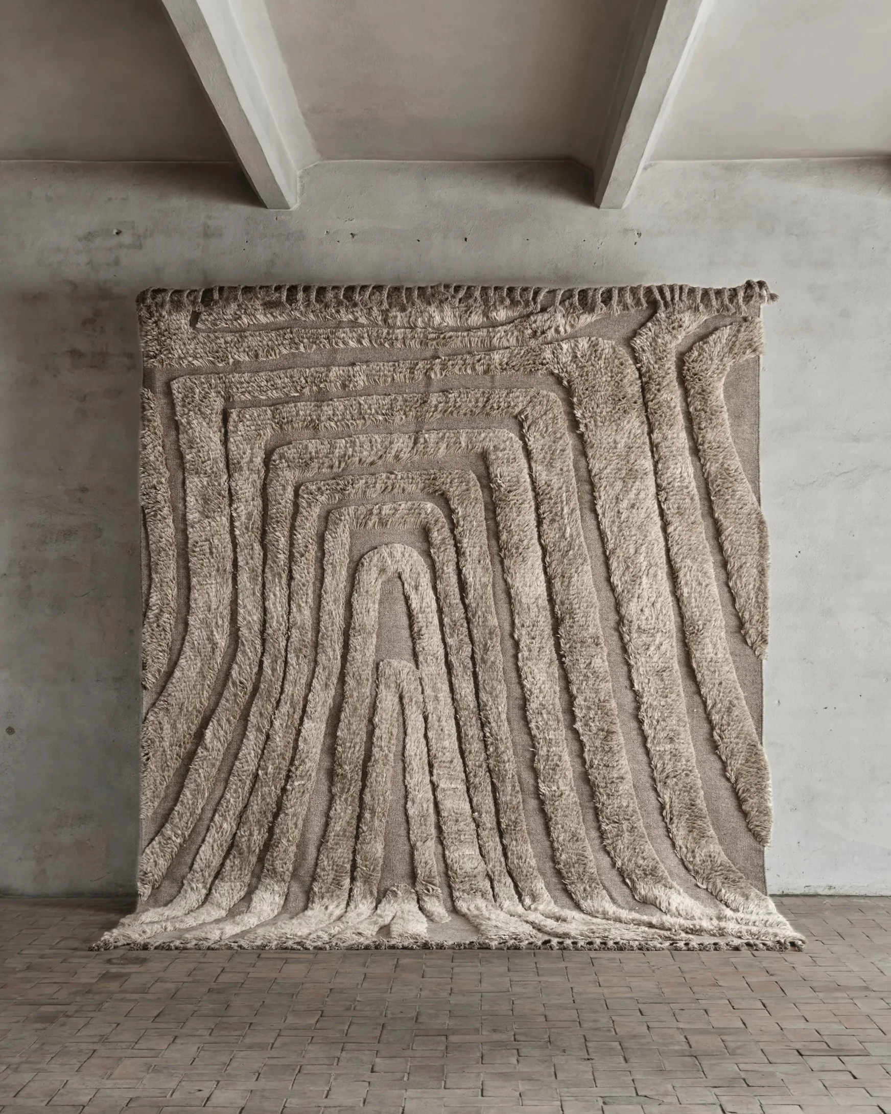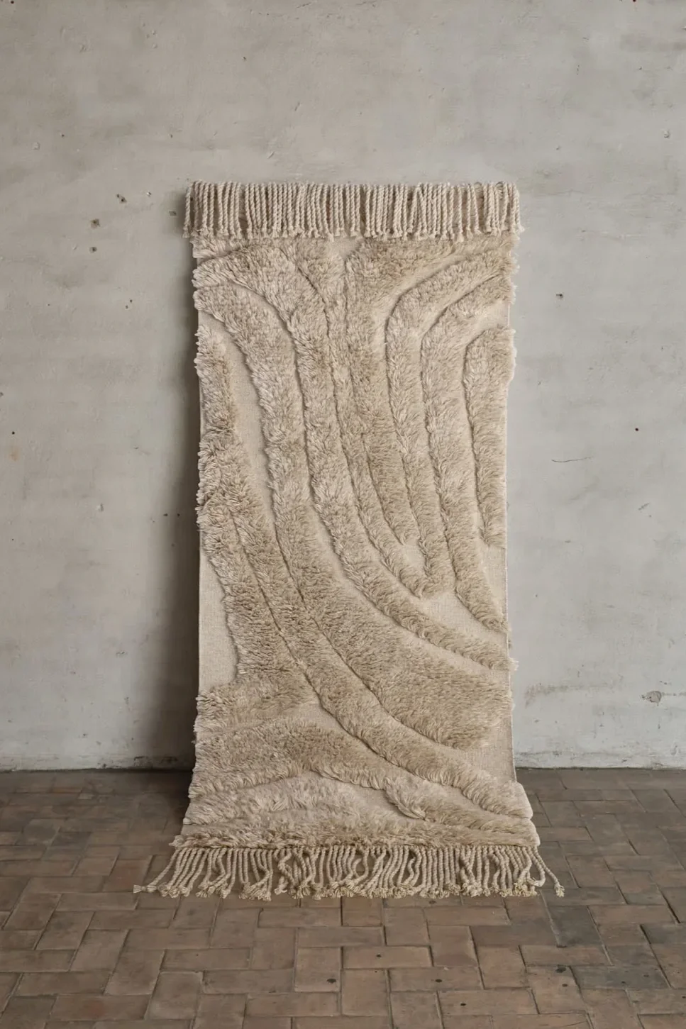 No.04 is a decorative hand-woven rug with a soft irregular hand-knotted pile that creates a vivid pattern and intriguing feel. Braided fringes elevates the end line and adds an arty and ethnic detail.