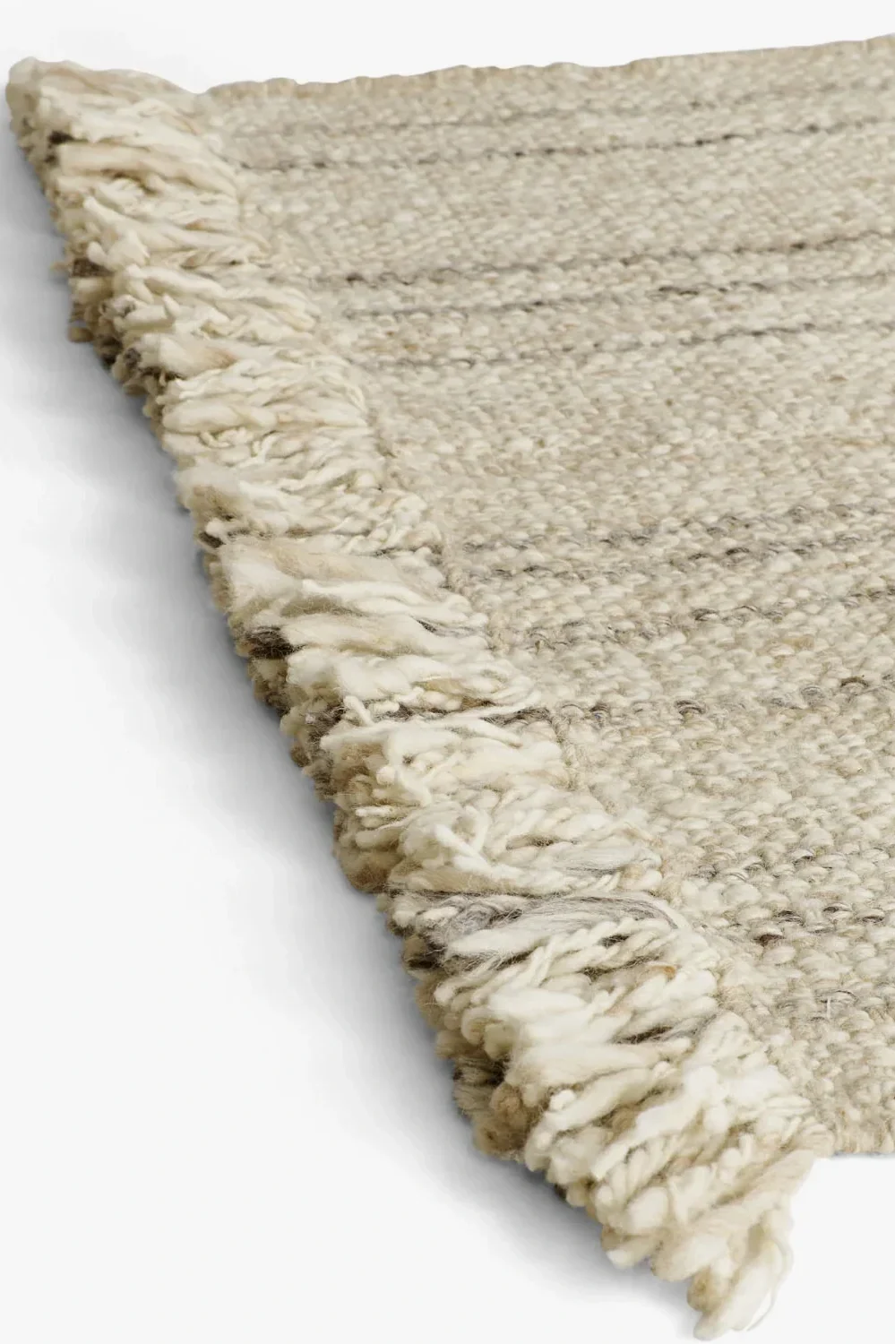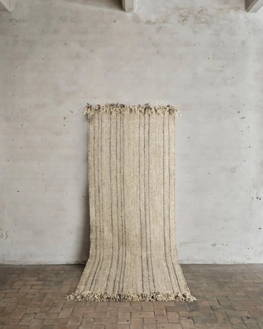 Colonnade no.06 is a hand-woven wool rug that features a gentle light melange beige shade adorned with subtle darker grey-brown stripes, creating a harmonious and delicate effect.