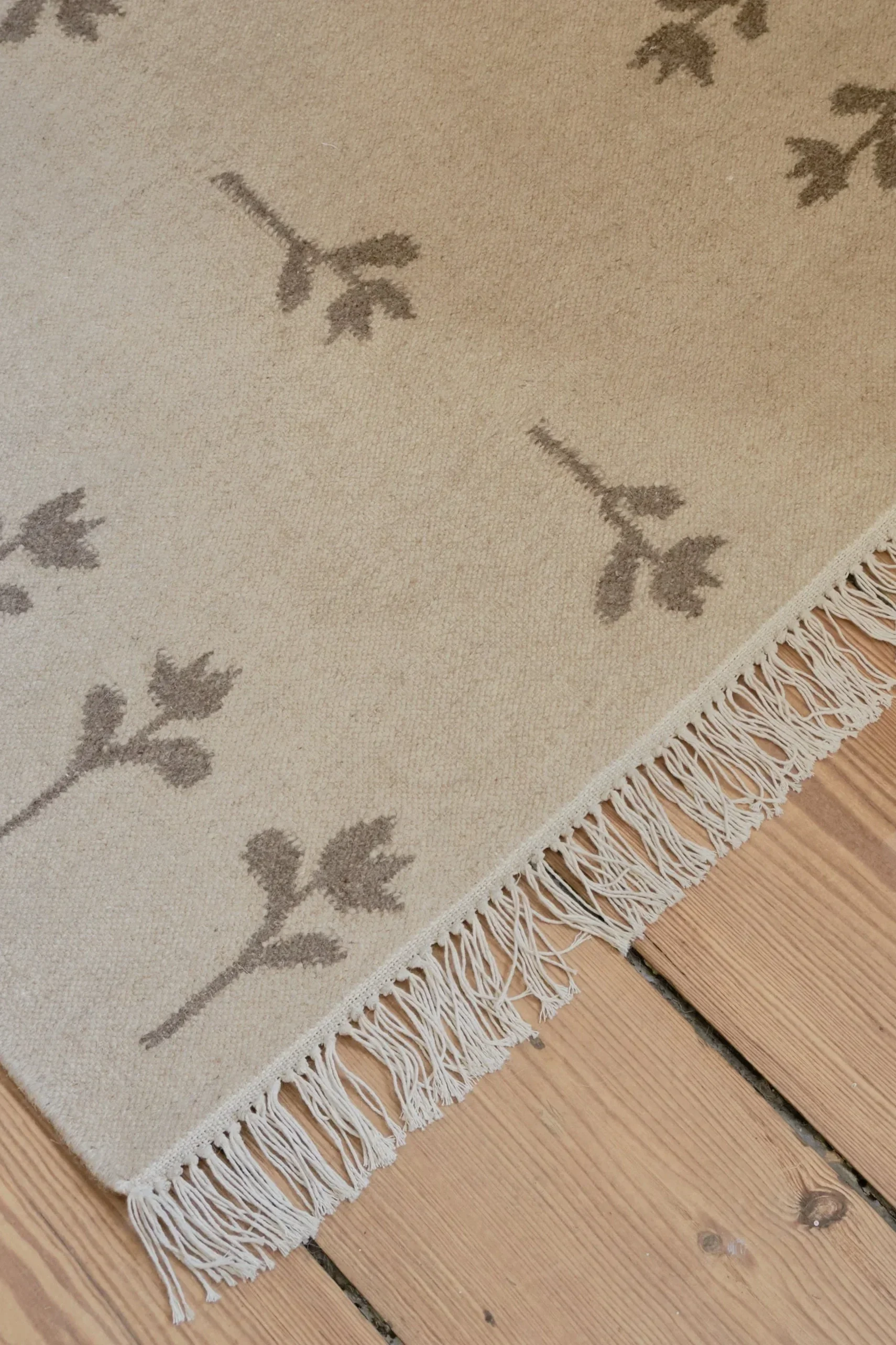 No.17 is a light, flat-woven rug in natural wool. The rug is designed in a mid-beige foundation with soft-brown woven flowers that draw inspiration from ancient Scandinavian tulip patterns, A thin fringe row decorates the edges, providing a simple but important detail to the overall design.