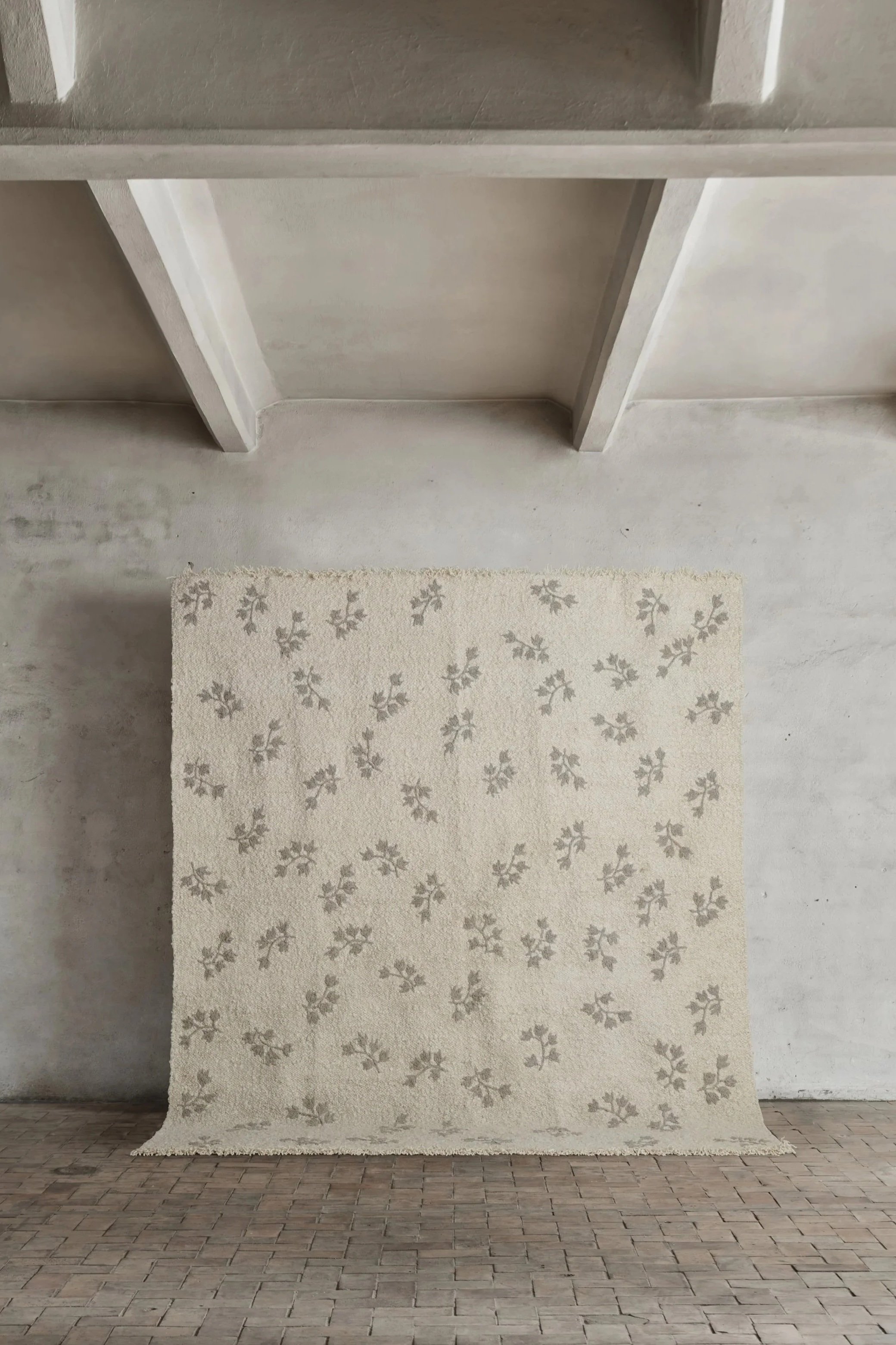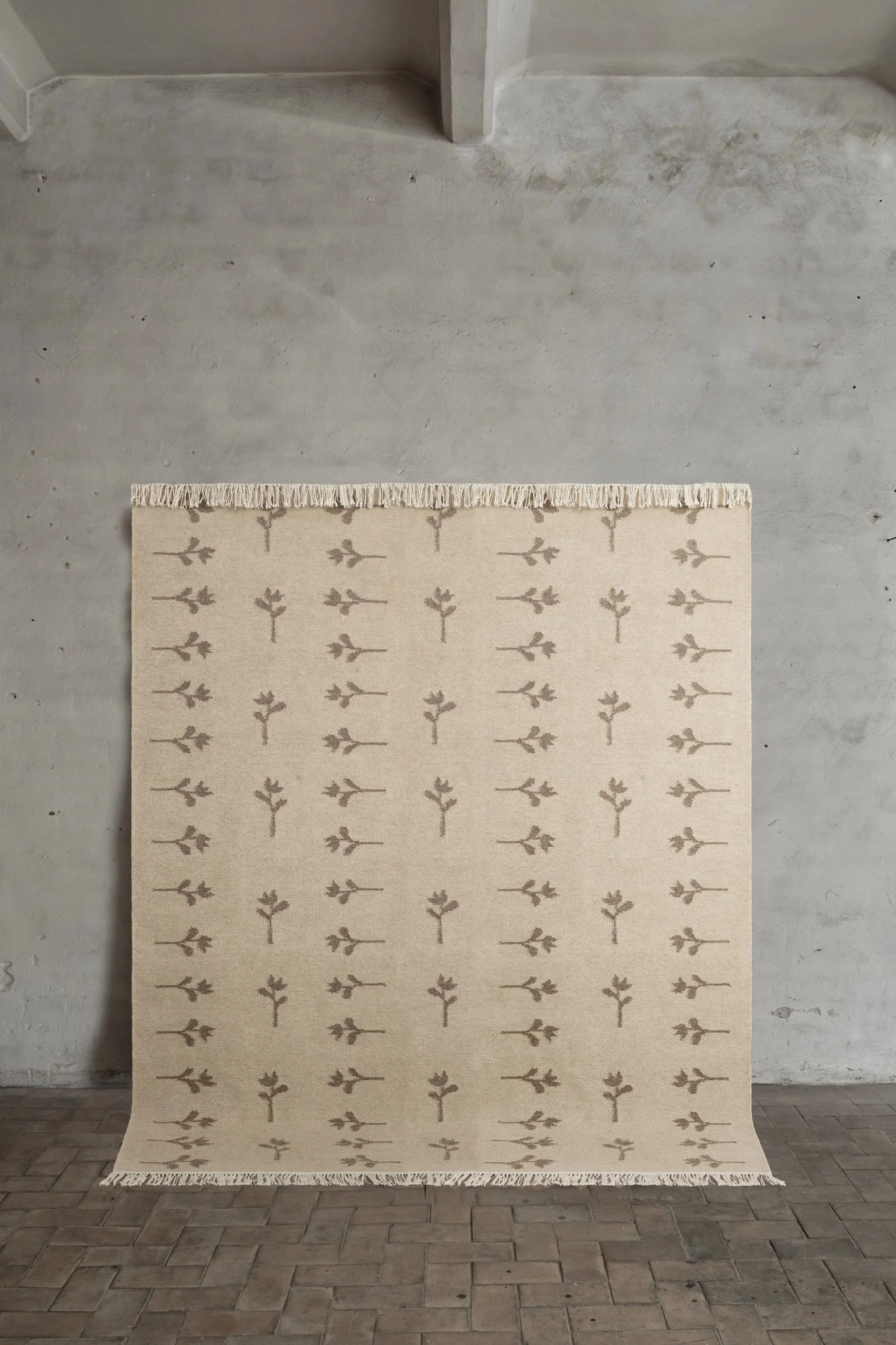 No.18 is a grey-brown flat-woven rug with light beige hand-knotted floral pattern which gives a slightly high-and low effect. The flowers draws inspiration from ancient Scandinavian tulip-patterns and brings forth a homage to these roots.