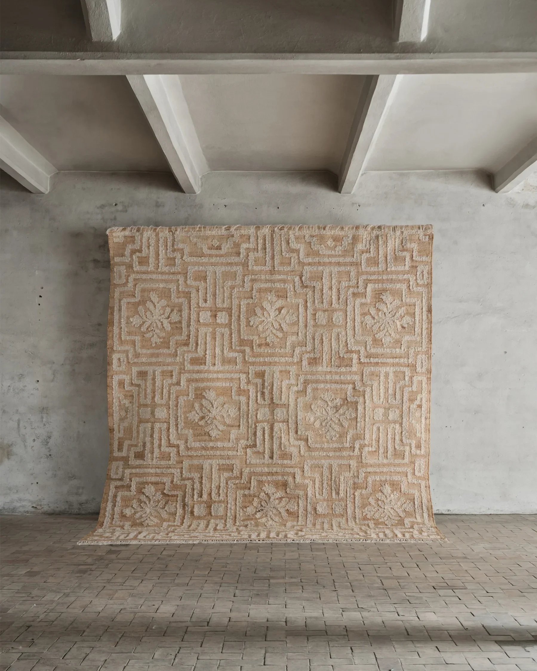 No.22 is a light, flat-woven, rug crafted from natural jute and wool. The rug features a natural jute foundation, adorned with a graphical floral motif in white natural wool, combining hard and soft elements through contrasting patterns.