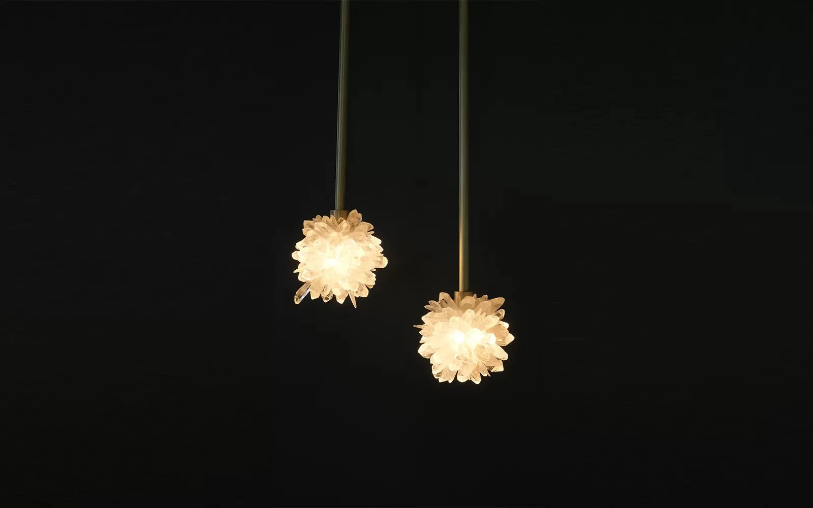 A hemispherical form, feathered in clear quartz crystals, rests beneath a translucent substrate, protecting the precious material and forging a striking silhouette. By day, Theia stands as a sculptural centrepiece, its textured surface interacting with natural light to create dynamic reflections. At night, the piece transforms, casting a warm, ambient glow.