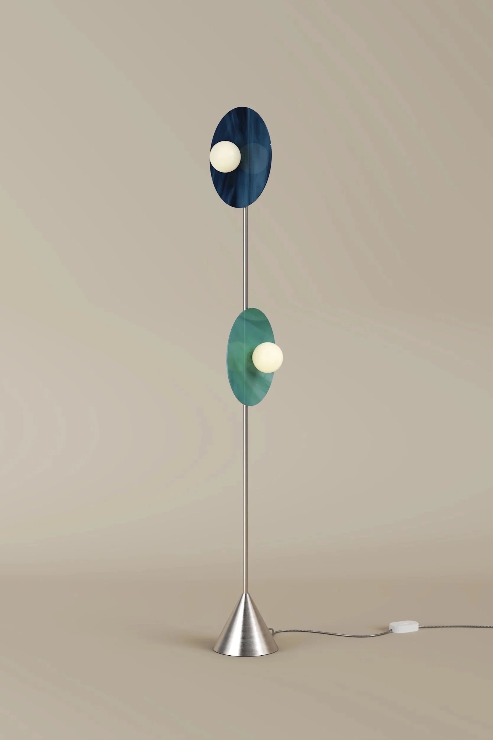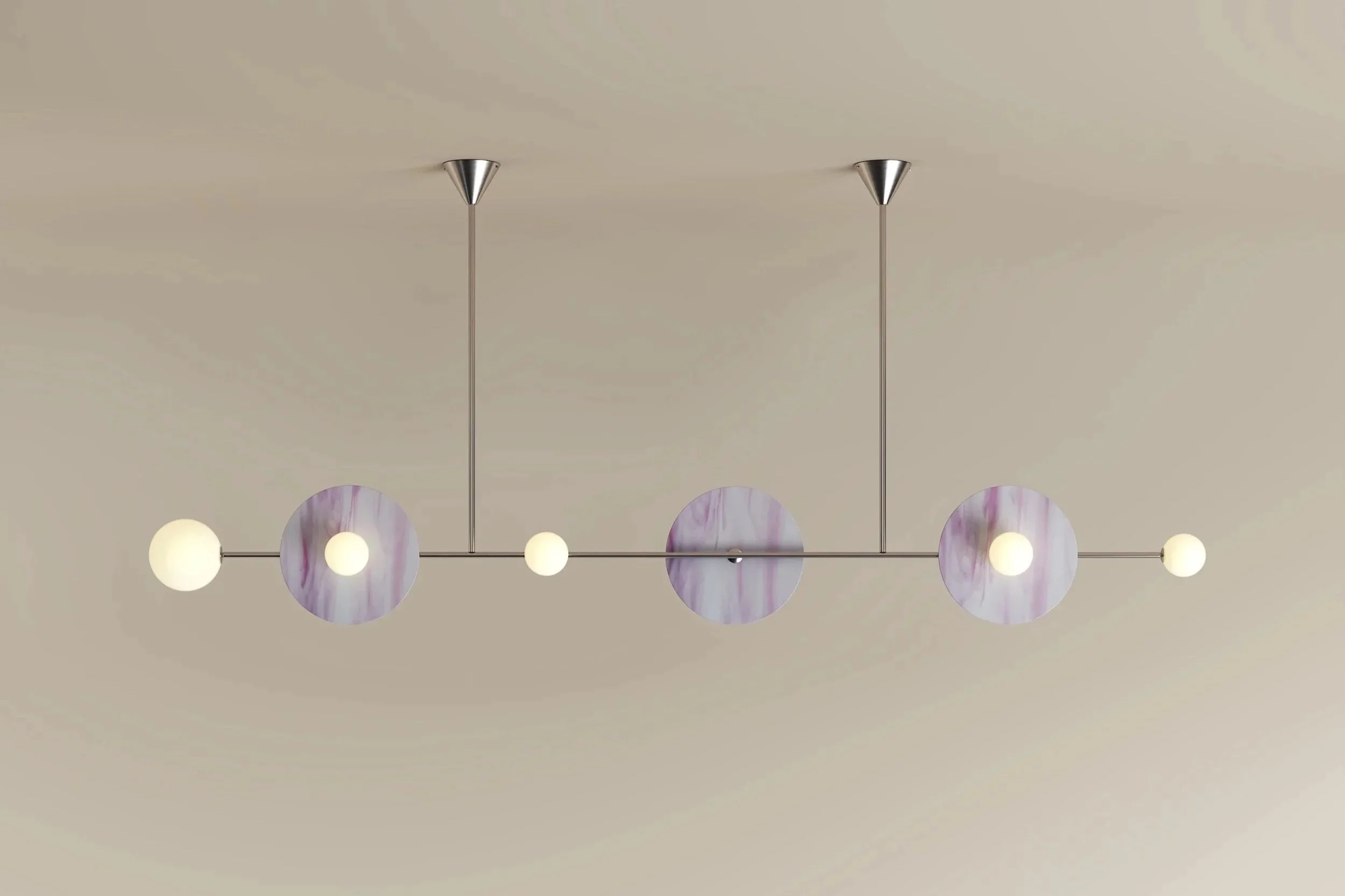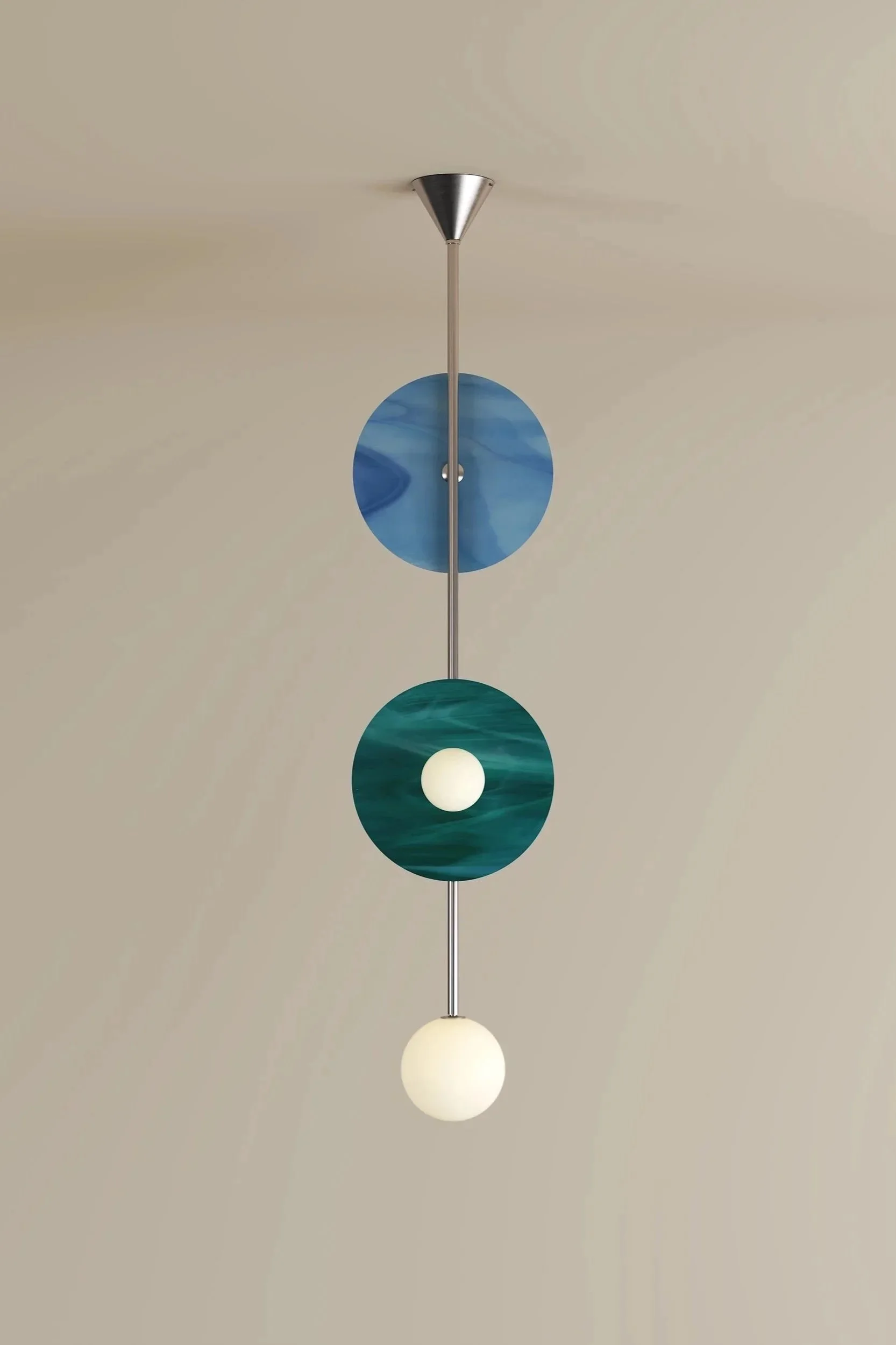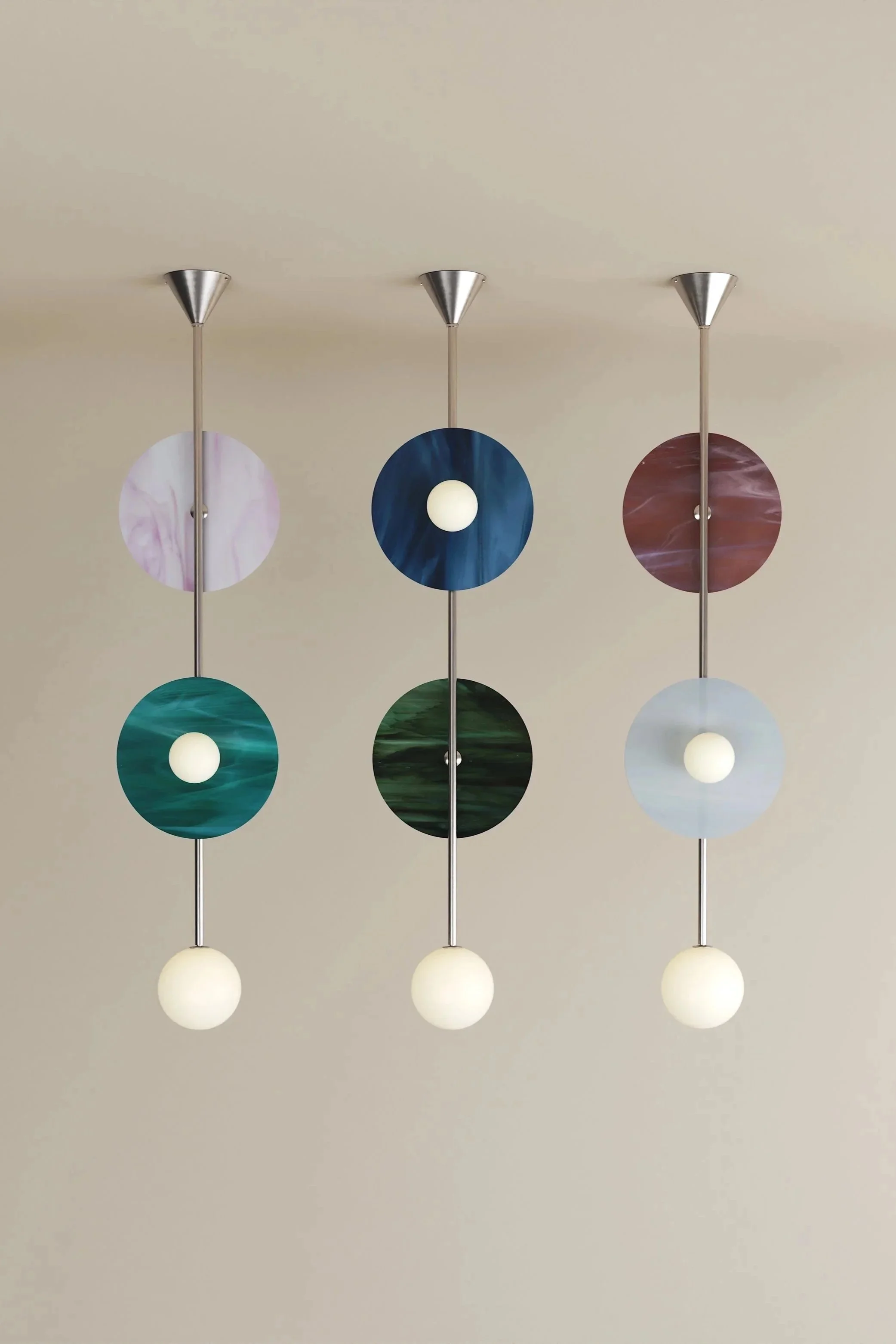 Brushed Brass Structure, Coloured Glass Discs, White Glass Globes
