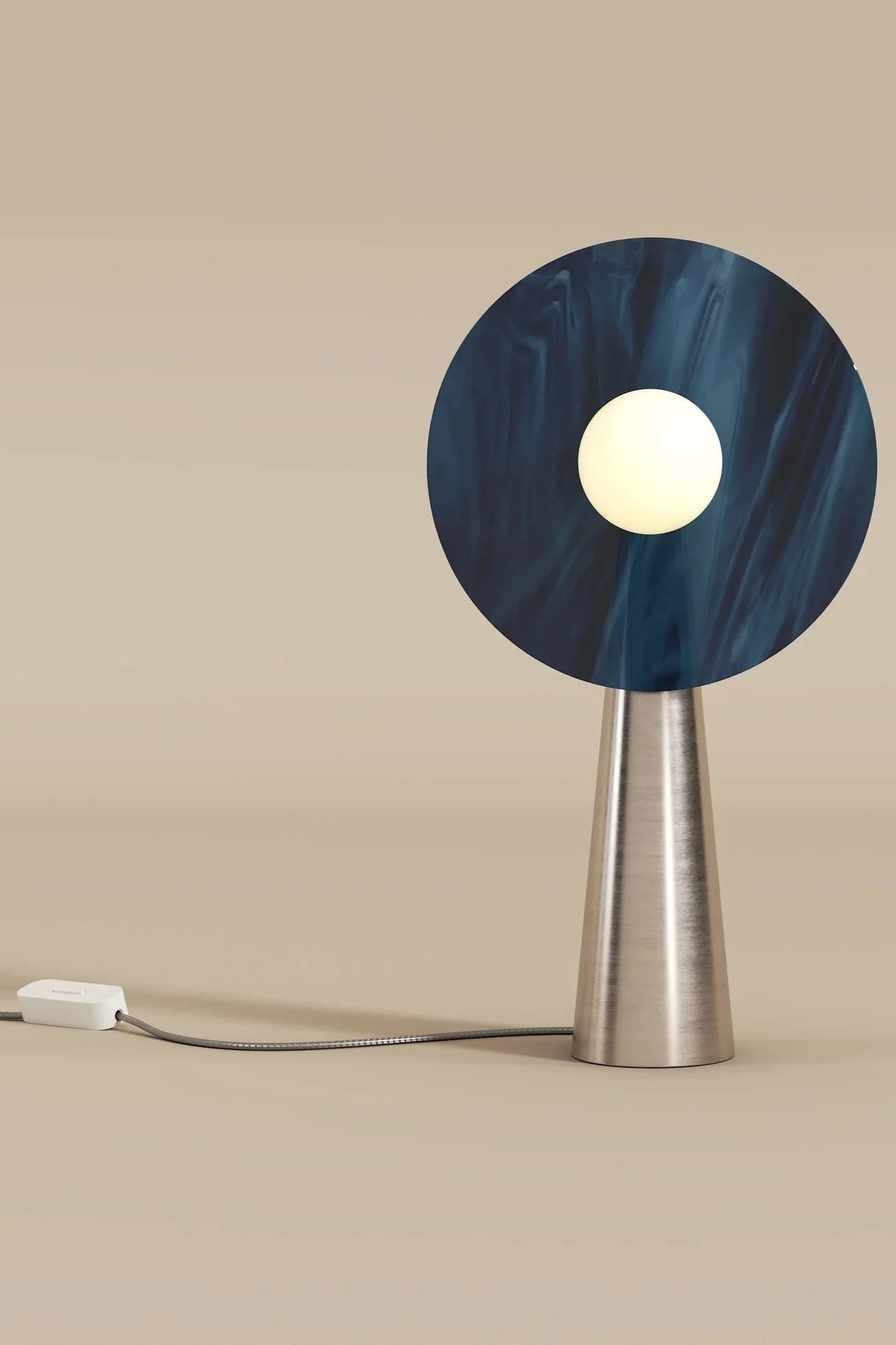 Disc and Sphere Glass explores the initial simple shape of a perfect round disc and a white sphere, but with an animated, irregular pattern created by handmade glass plates.