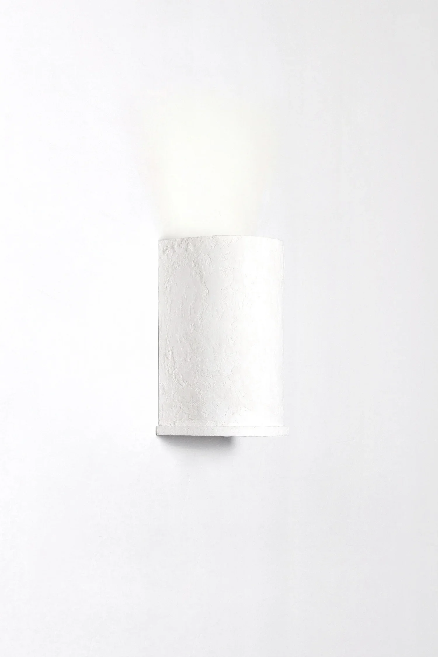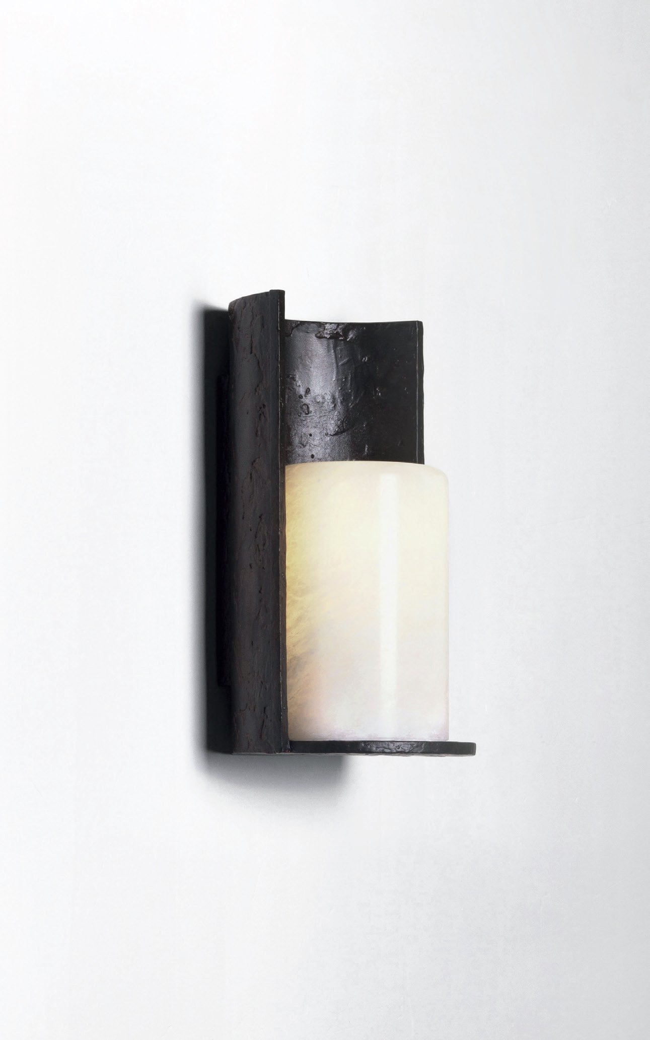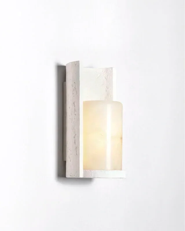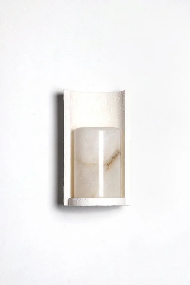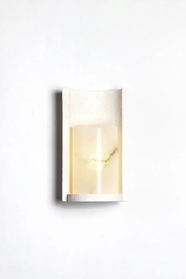Reinterpretation of torchere classical light, Cyrus sconce is made up of a plaster shell holding an alabaster shape.