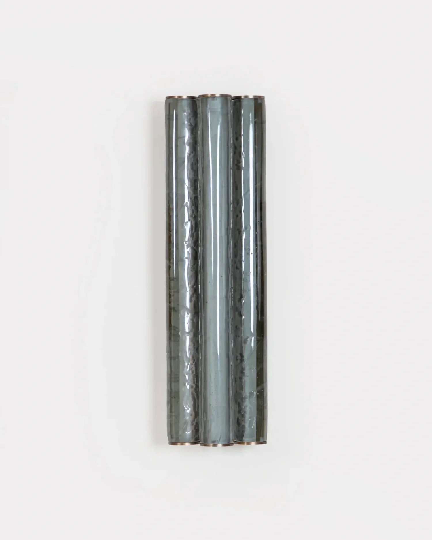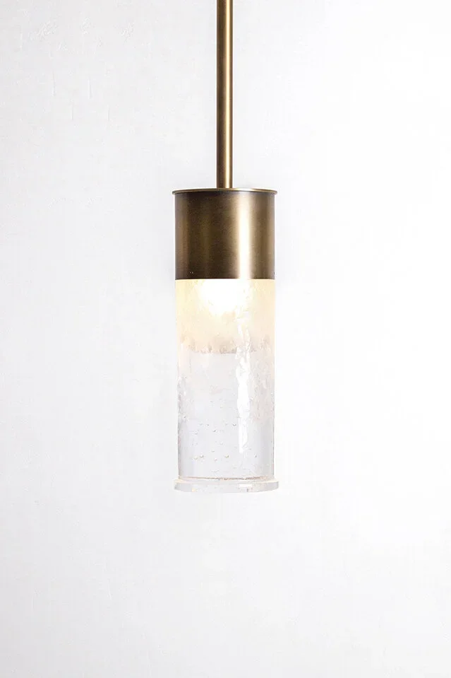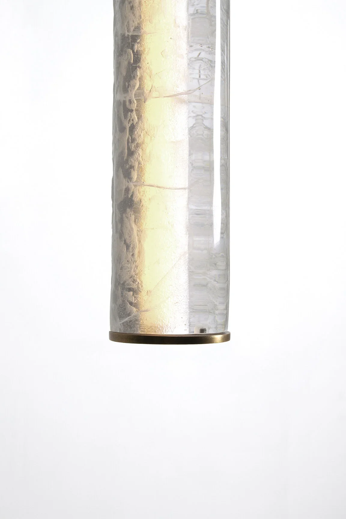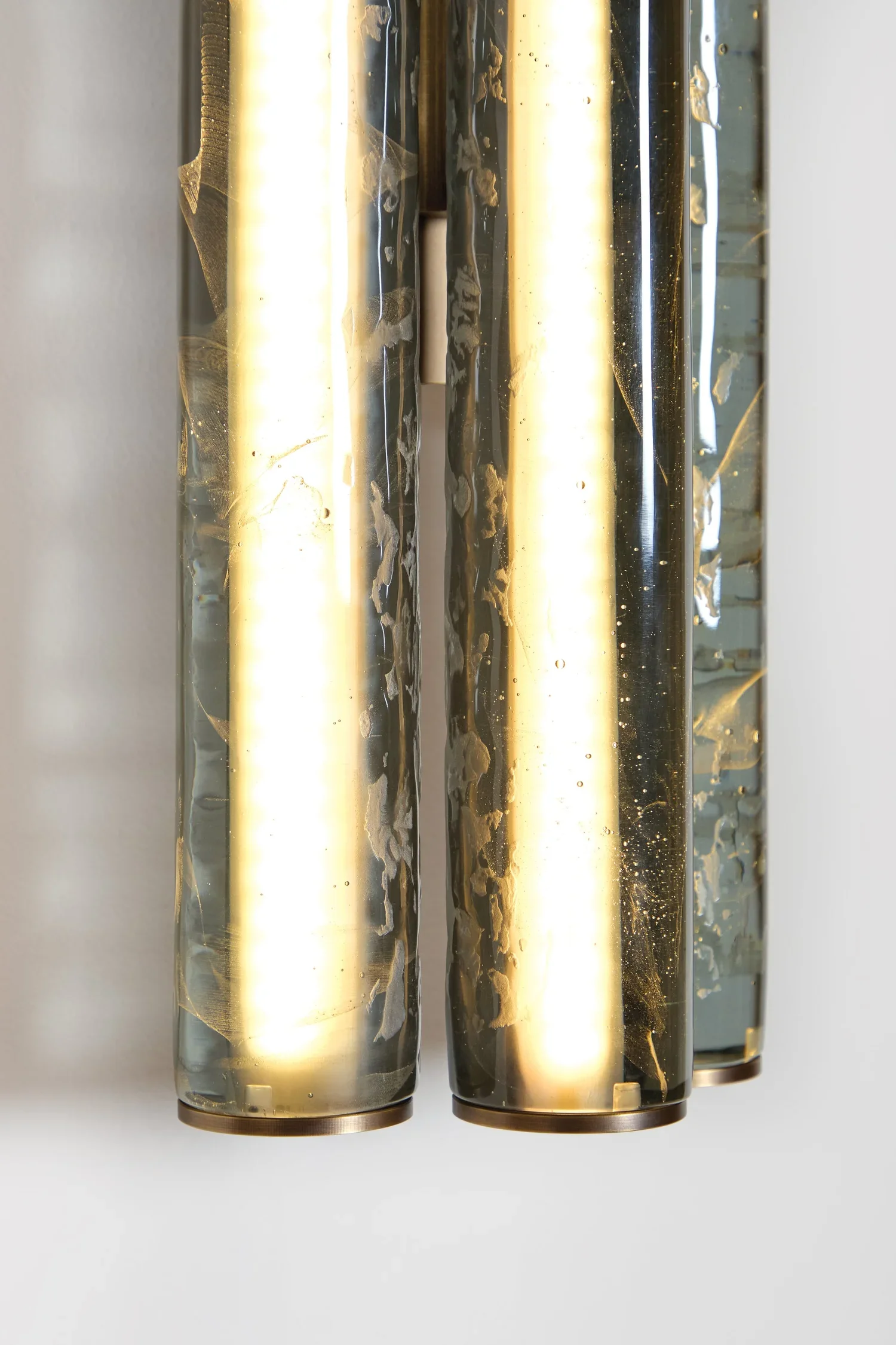 Pendant and sconce in lost-wax cast glass with a patinated brass structure. Each piece is numbered and signed.