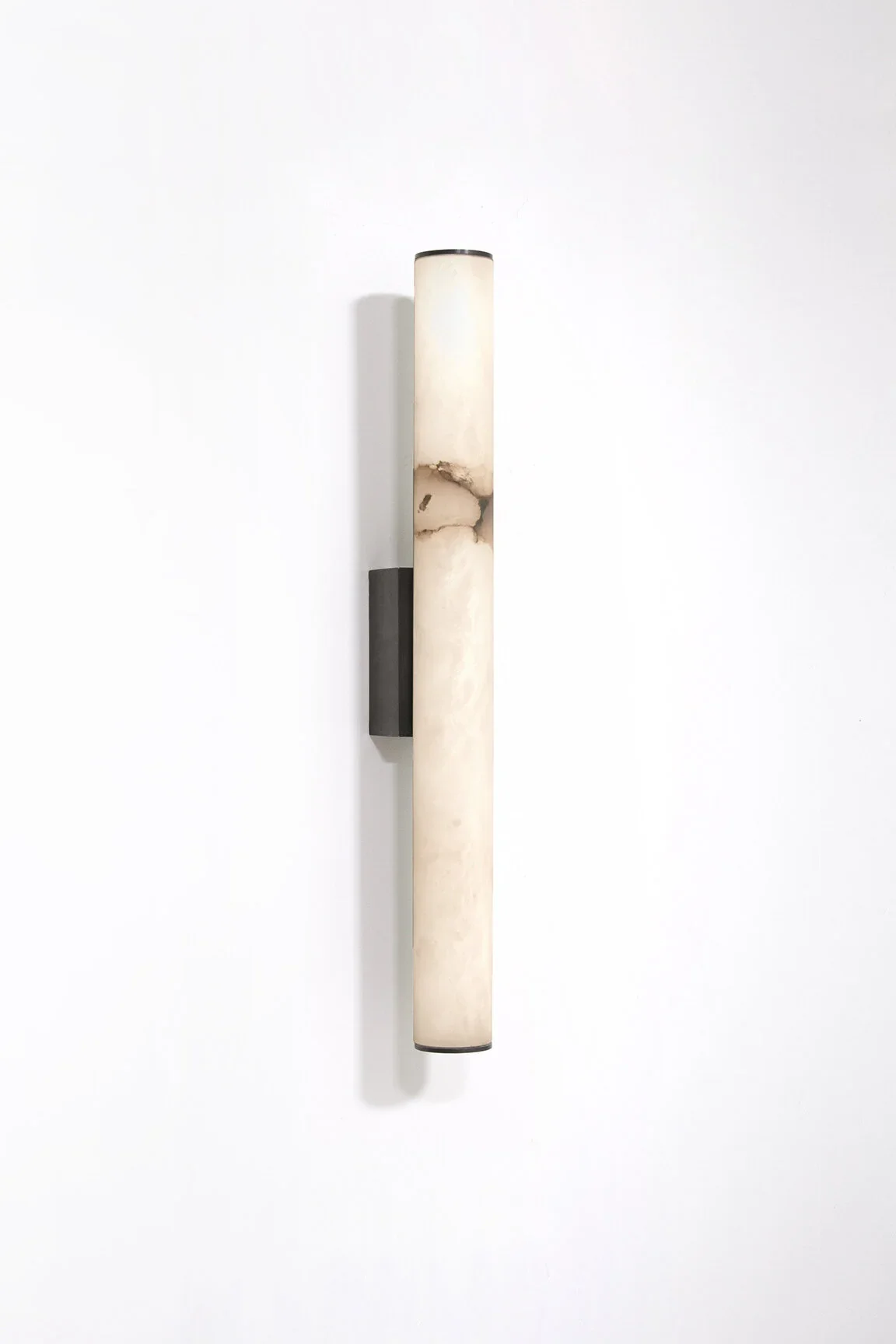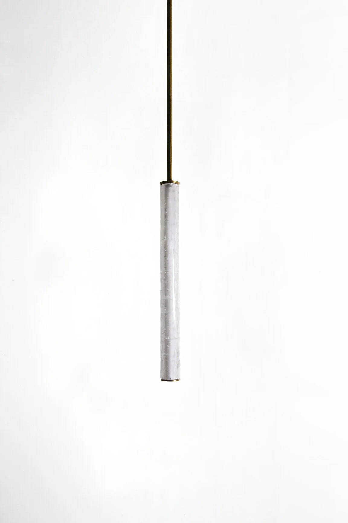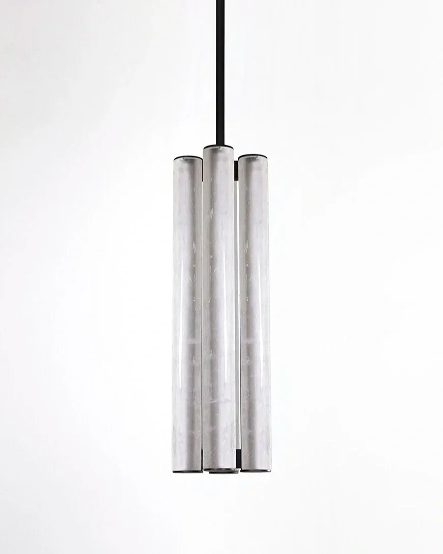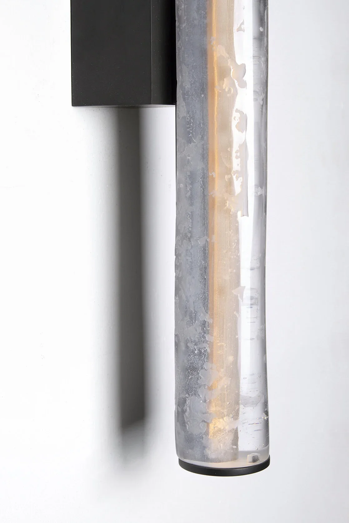 Pendant and sconce in lost-wax cast glass with a patinated brass structure. Each piece is numbered and signed.
