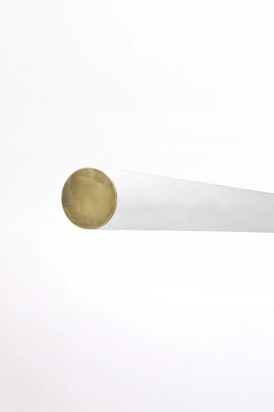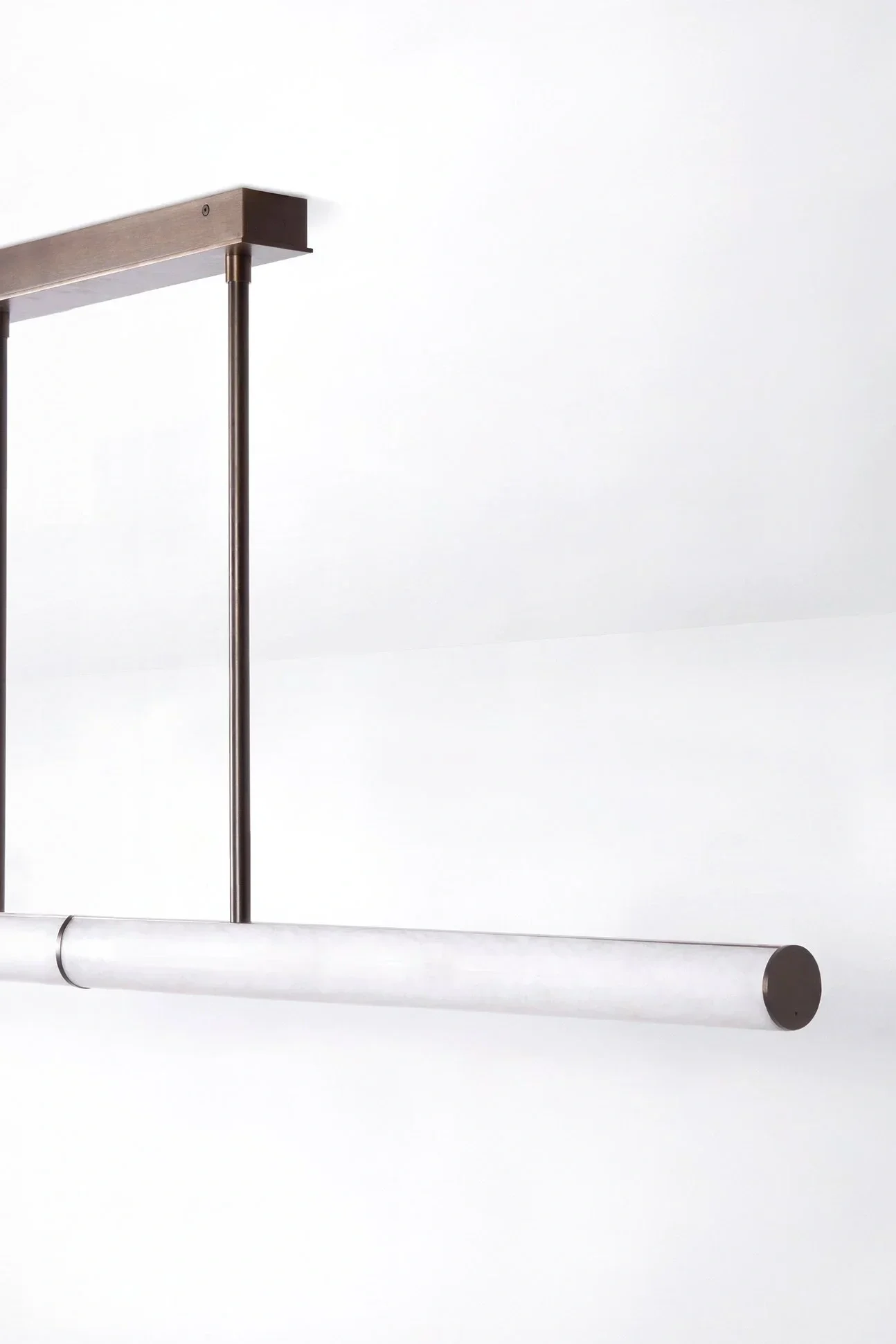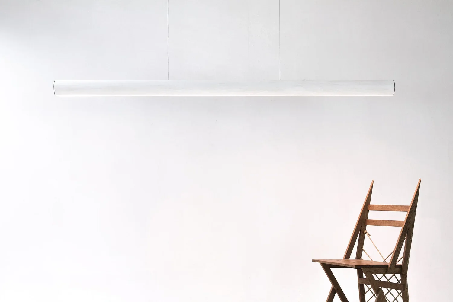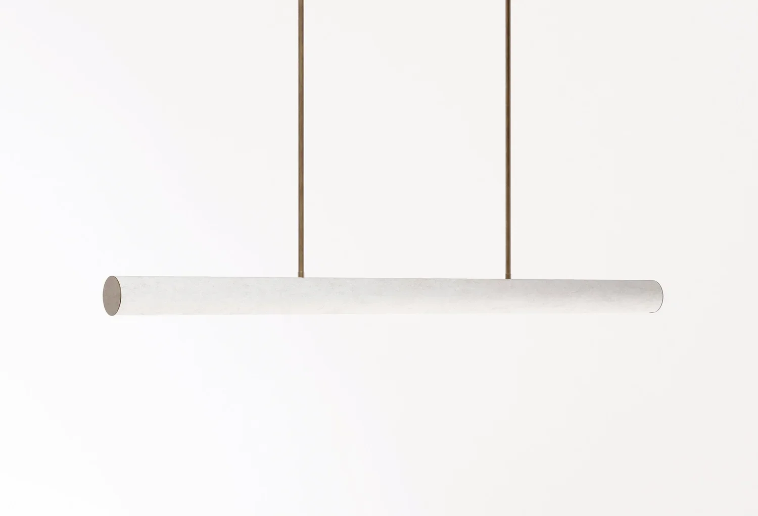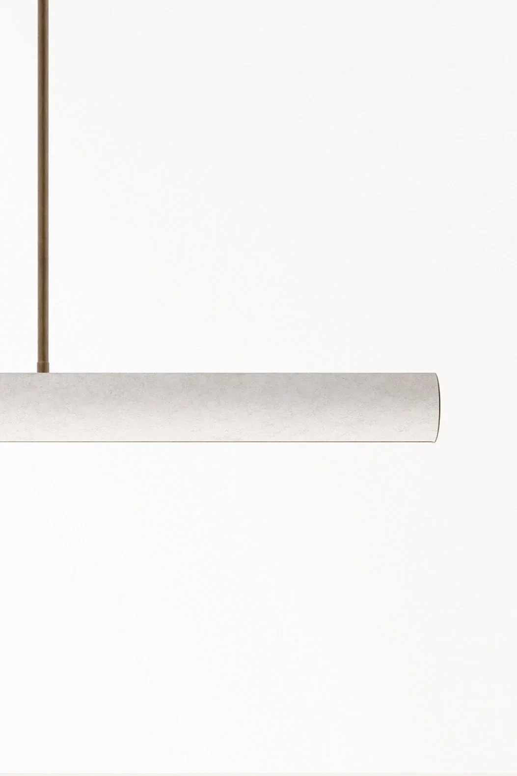Conceived as a plaster monolith hanged by almost invisible cables, Lutetia pendant seems to be levitating. Also exists with patinated brass tubes.