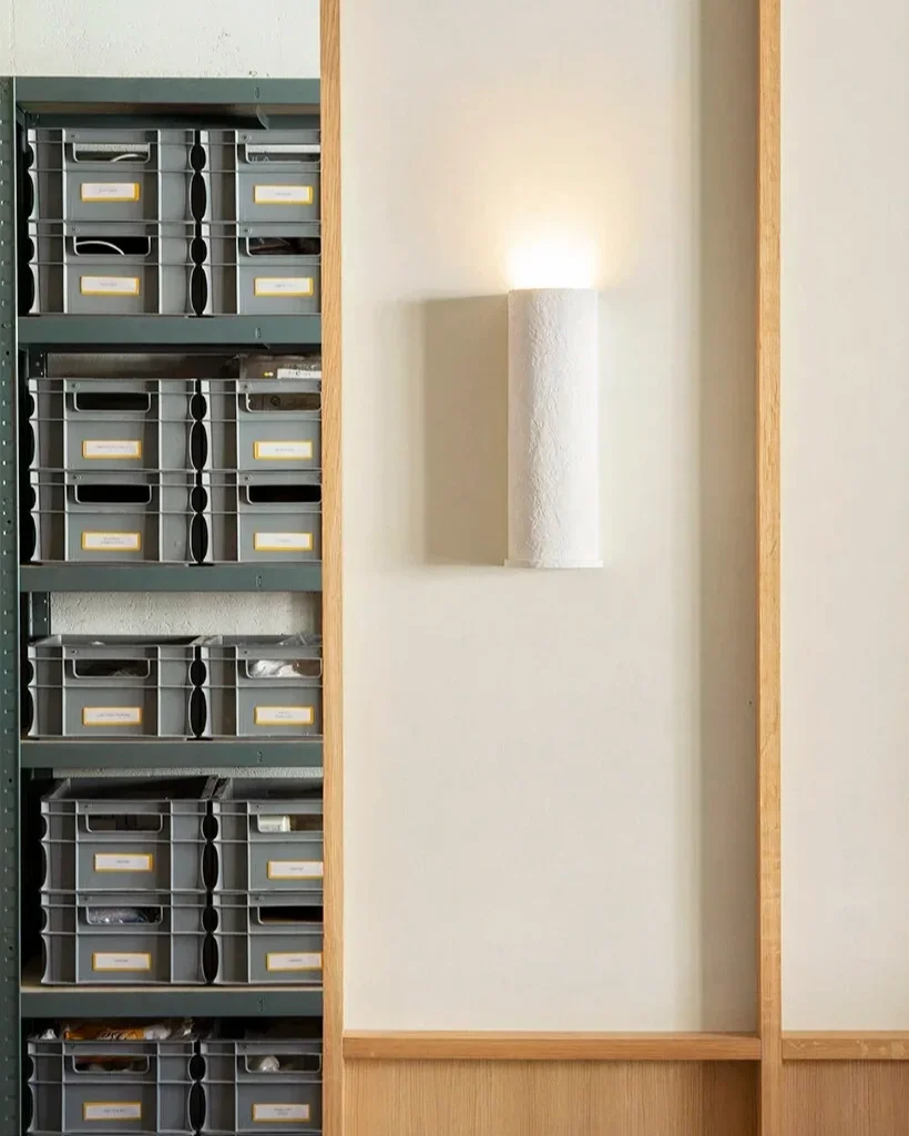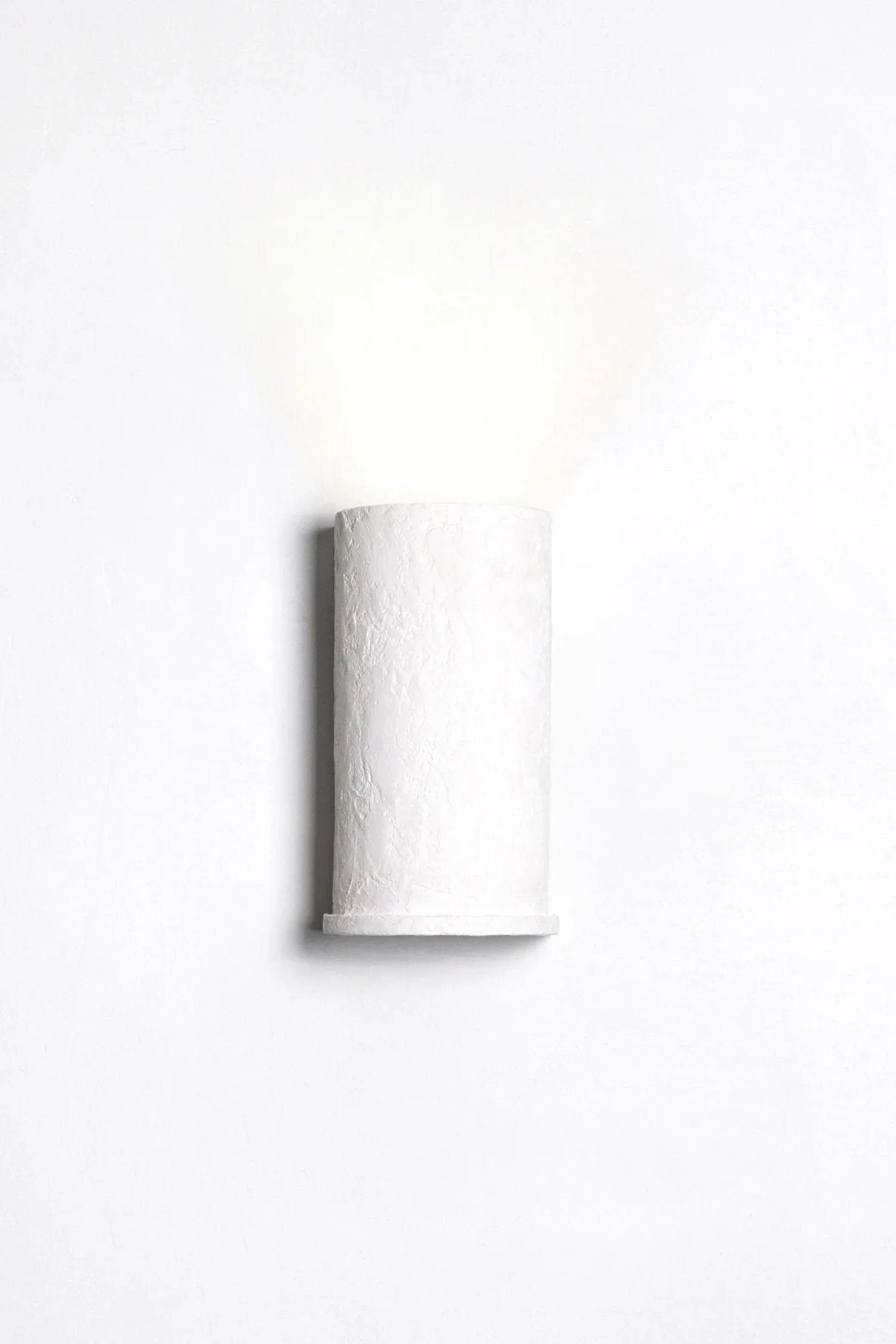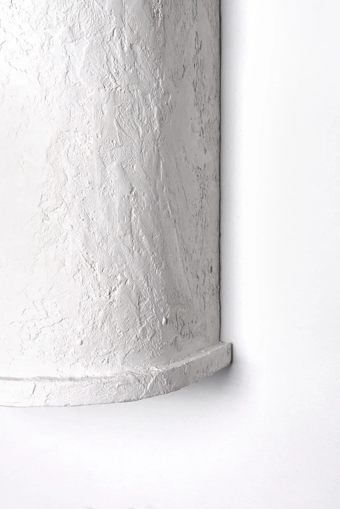 A sconce that features a subtle texture with gradient effect, on a plaster shape. Available in various sizes.