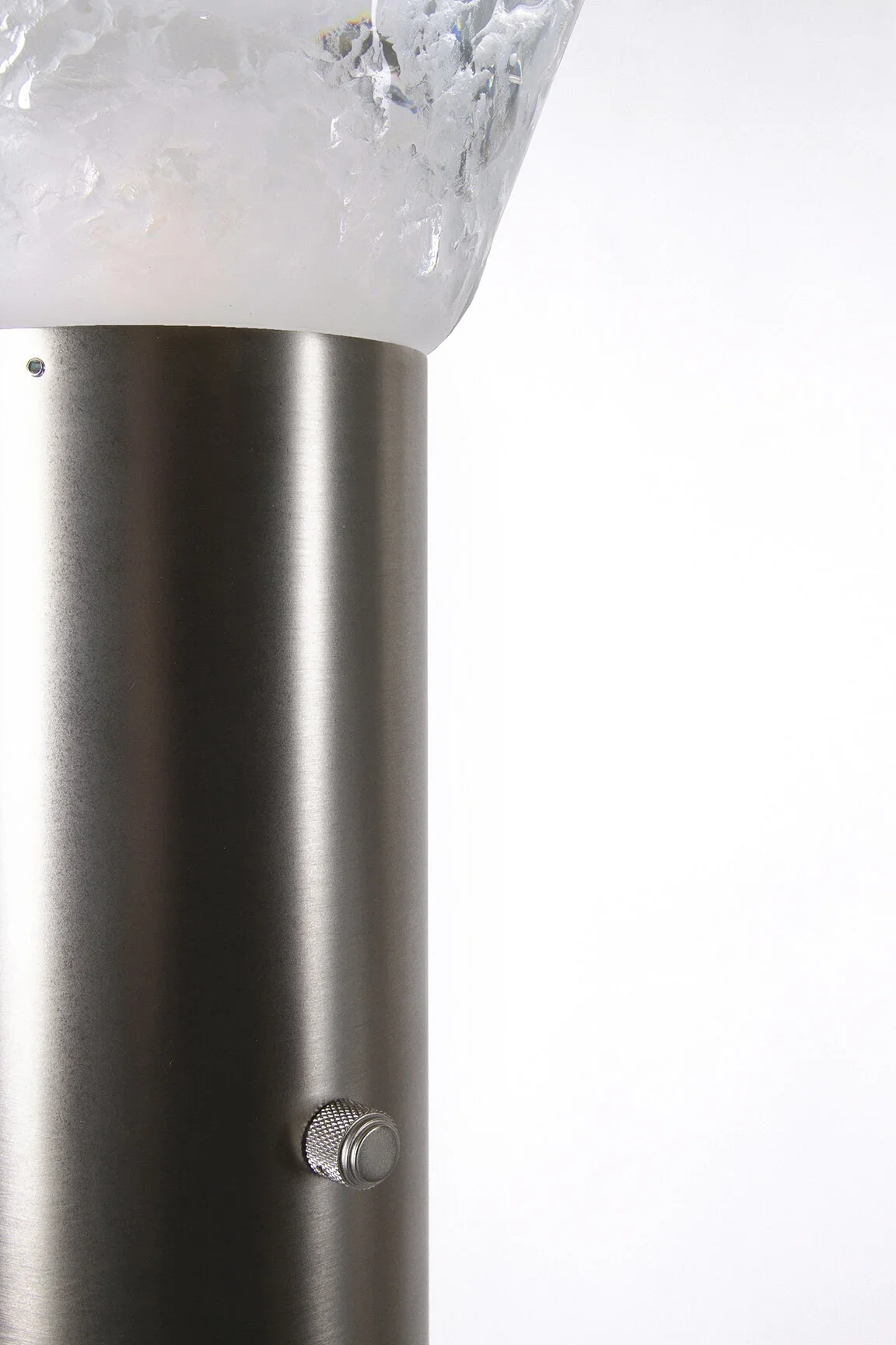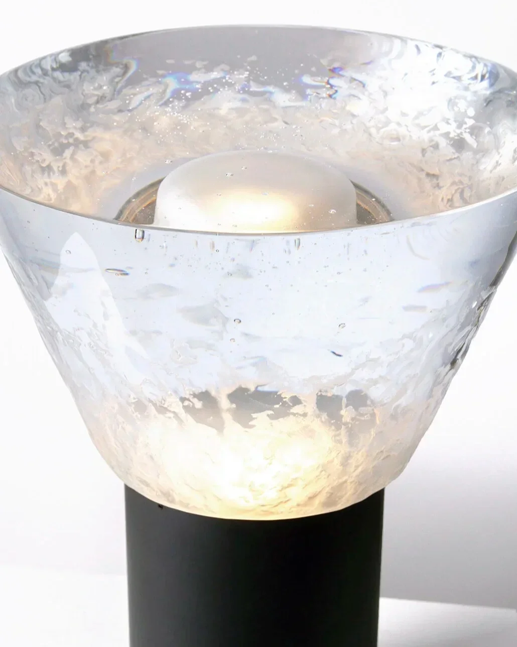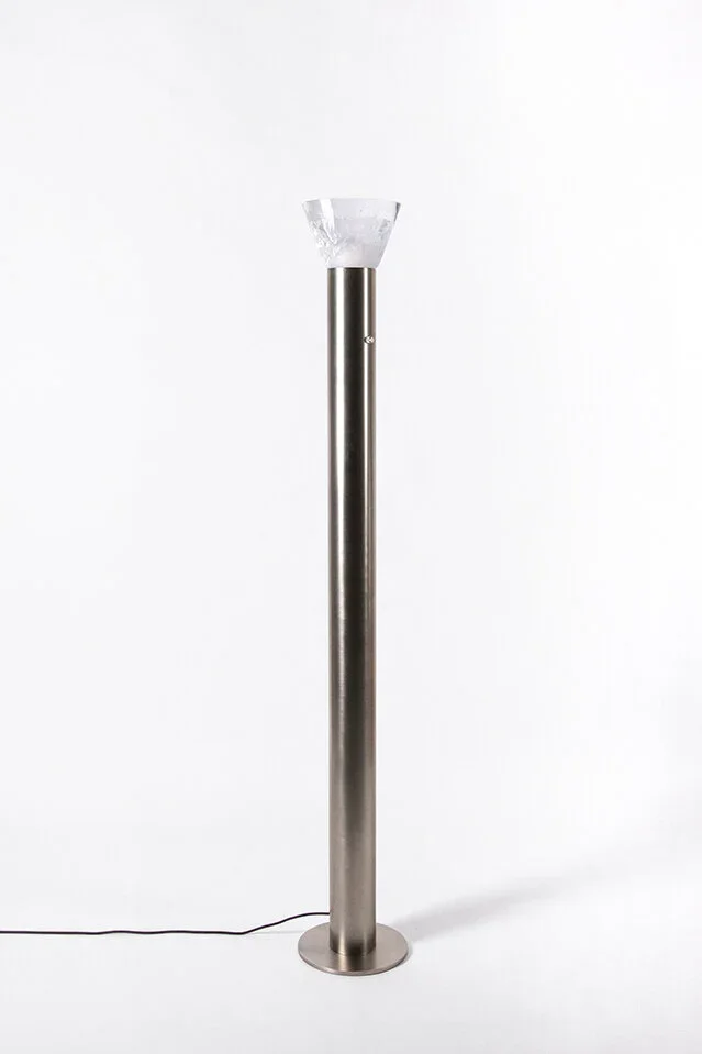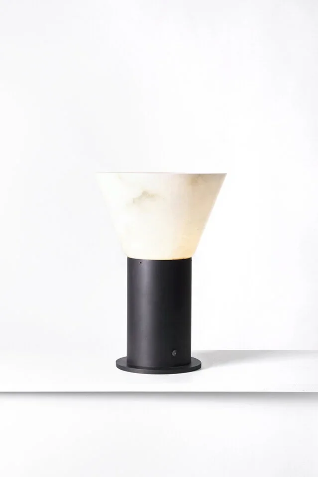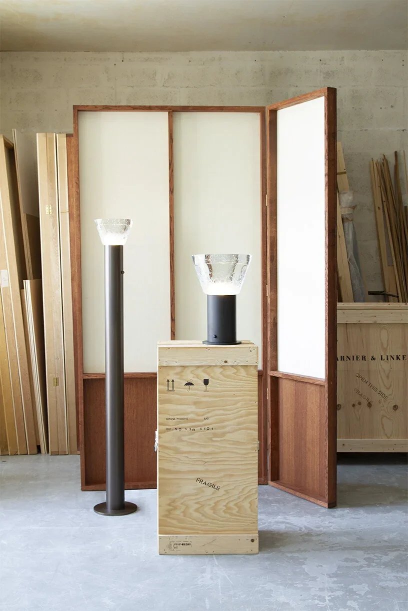 By combining a lost-wax cast glass cone and a patinated brass cylinder, Phoria revisits pedestal like a sculpture installed on top of a round column. It comes in table lamp and floor lamp.