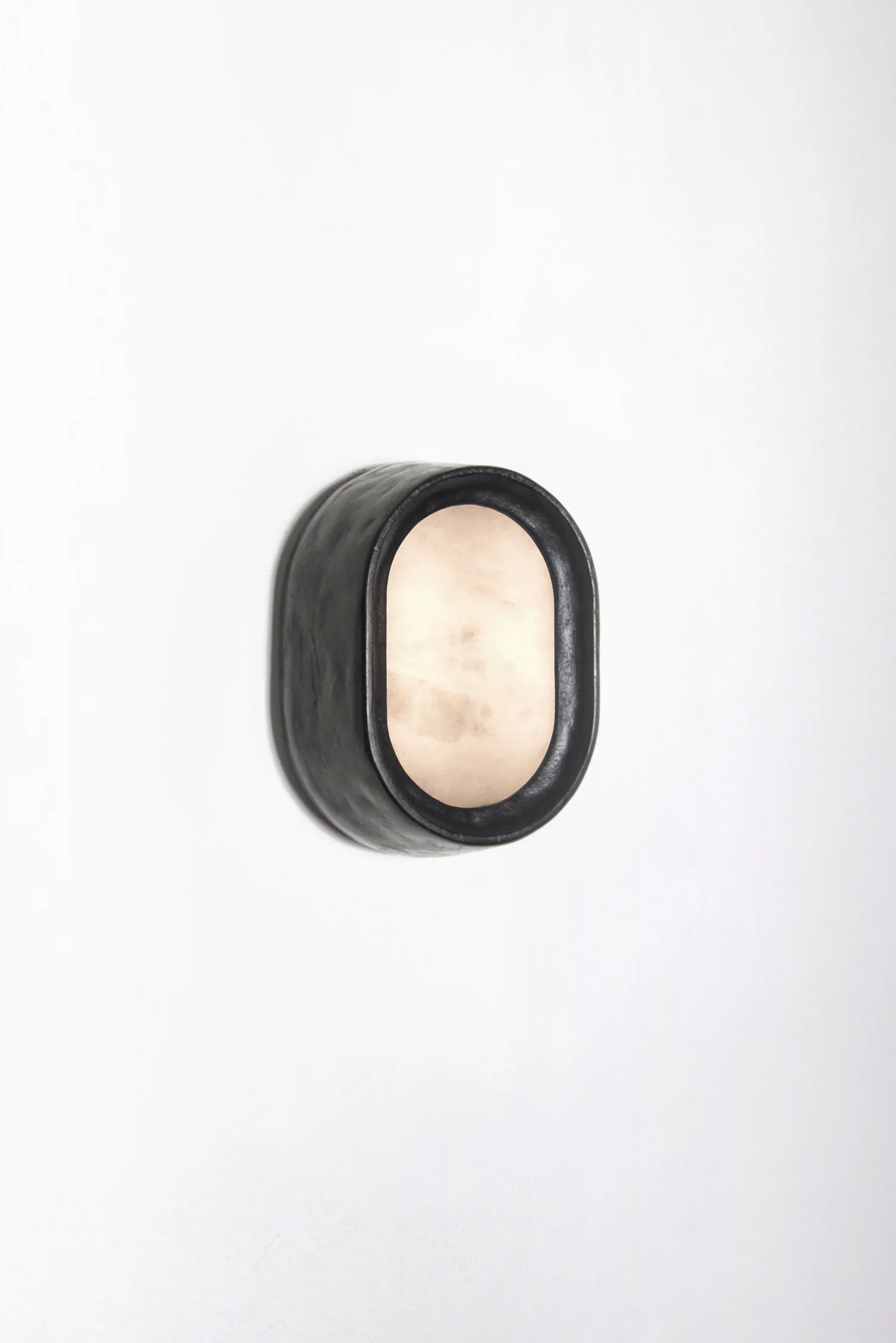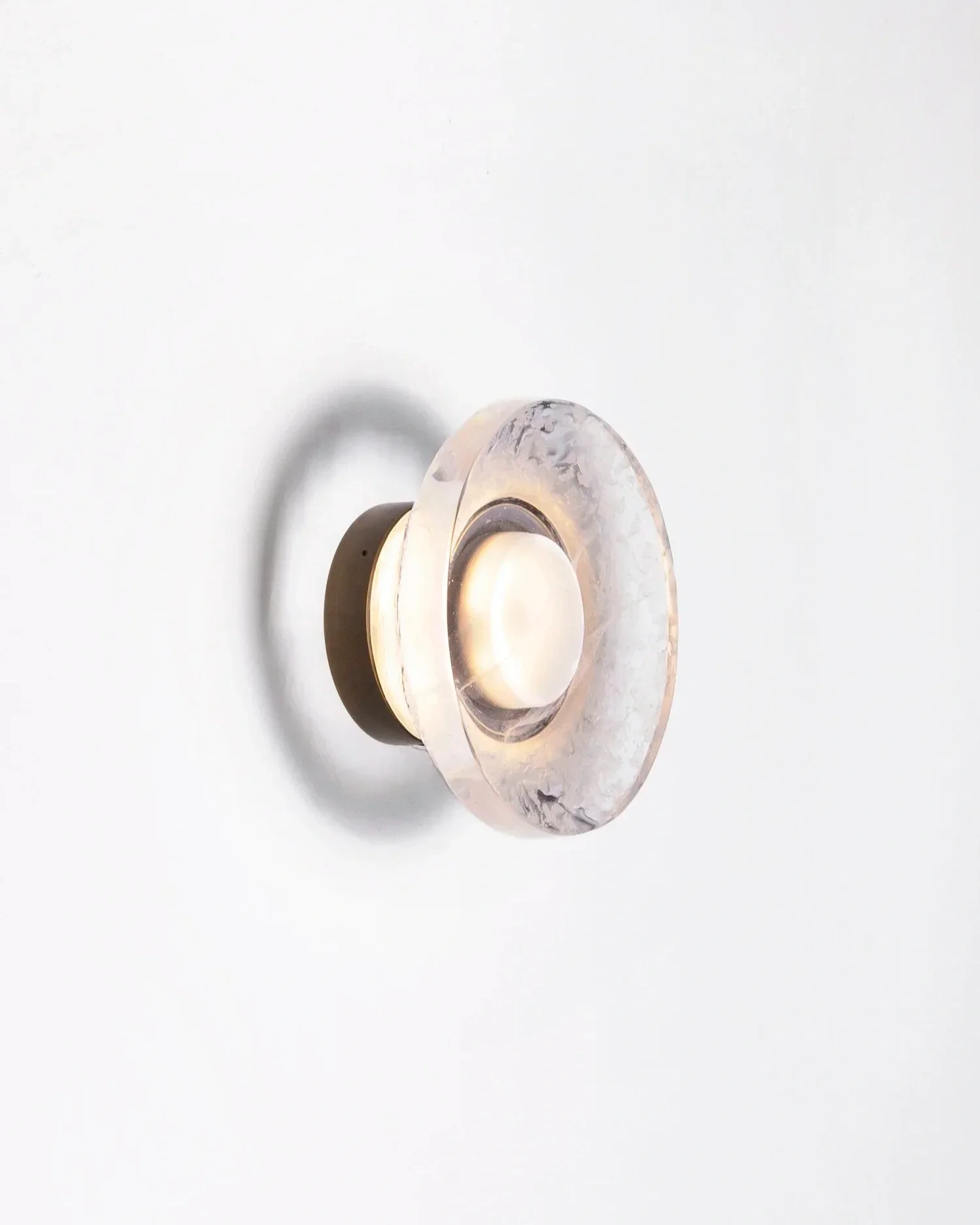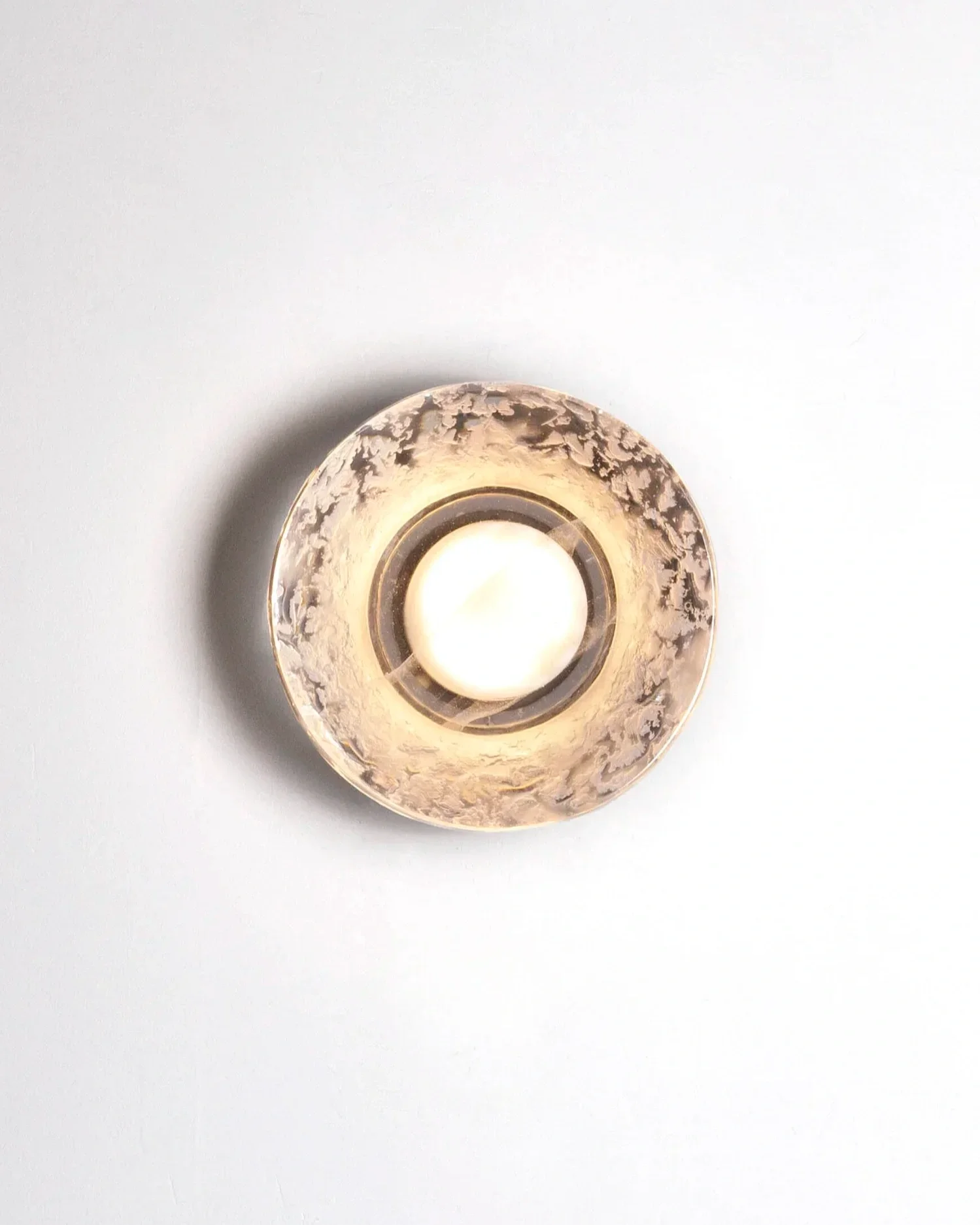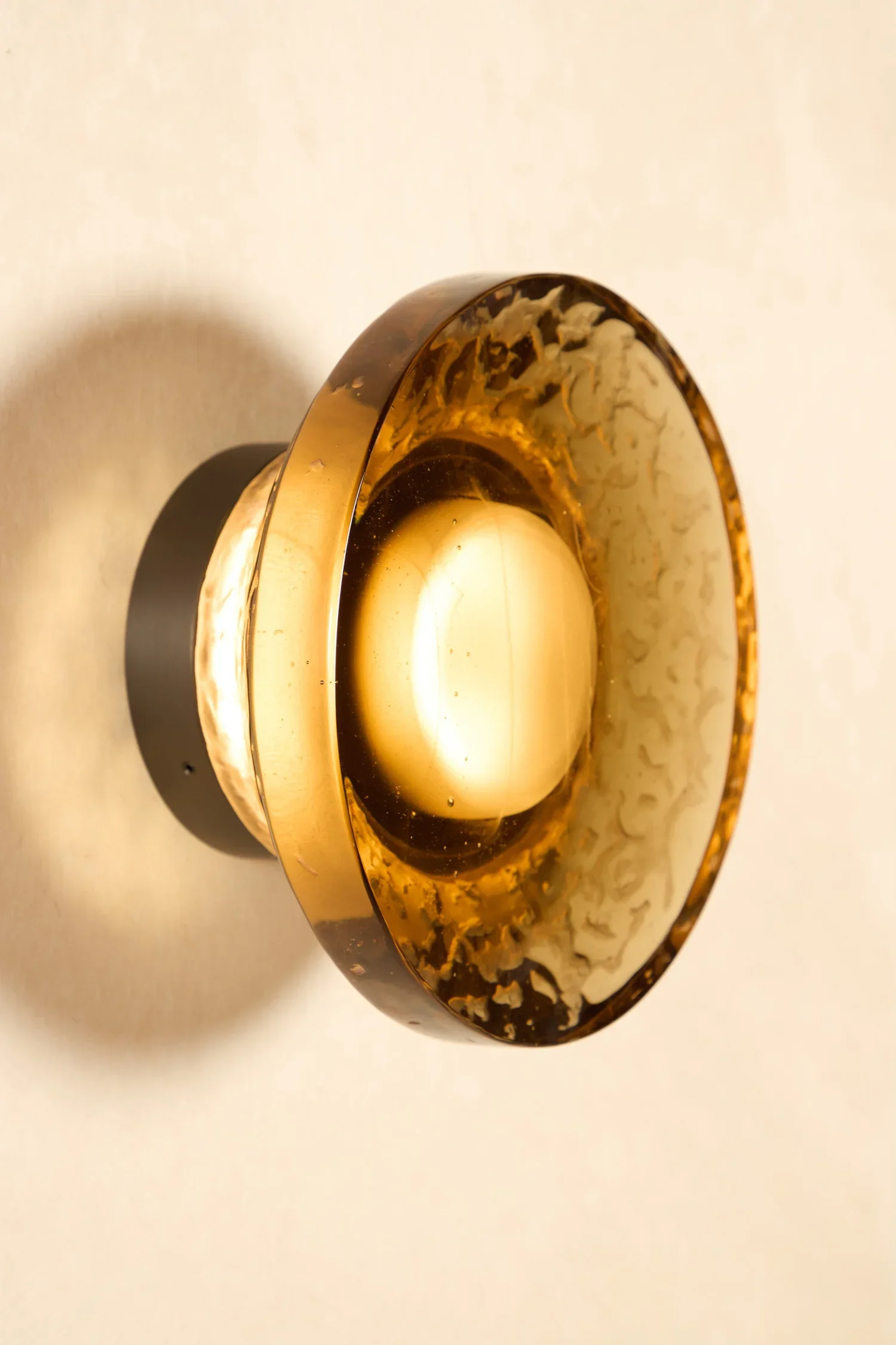 Inspired by optics, Retina series highlight a lost-wax cast glass shape inside a brass structure. Bubbles that appear randomly during process are emphasized by light. Can be used as ceiling light. Available in various glass colours.