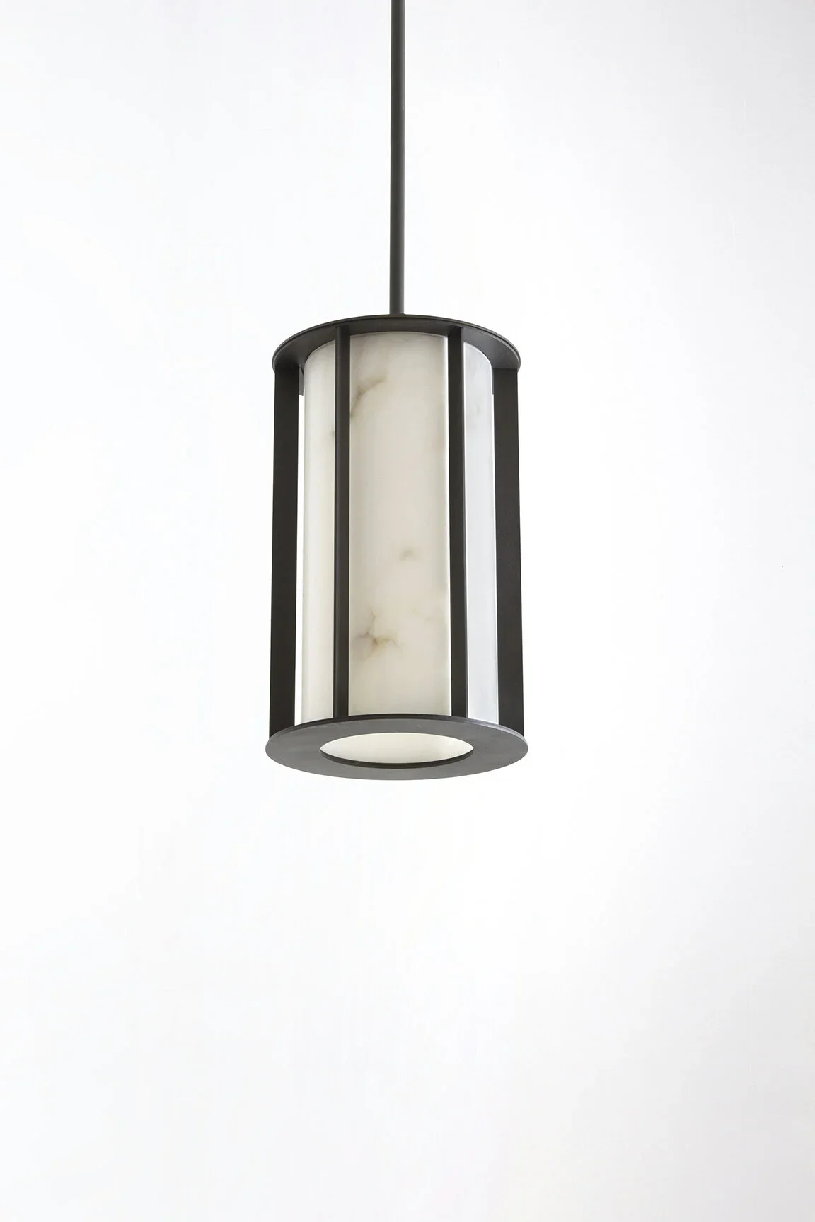 Conceived as a little cage with the light in its center, Shaft is a fixture made of patinated brass and alabaster.