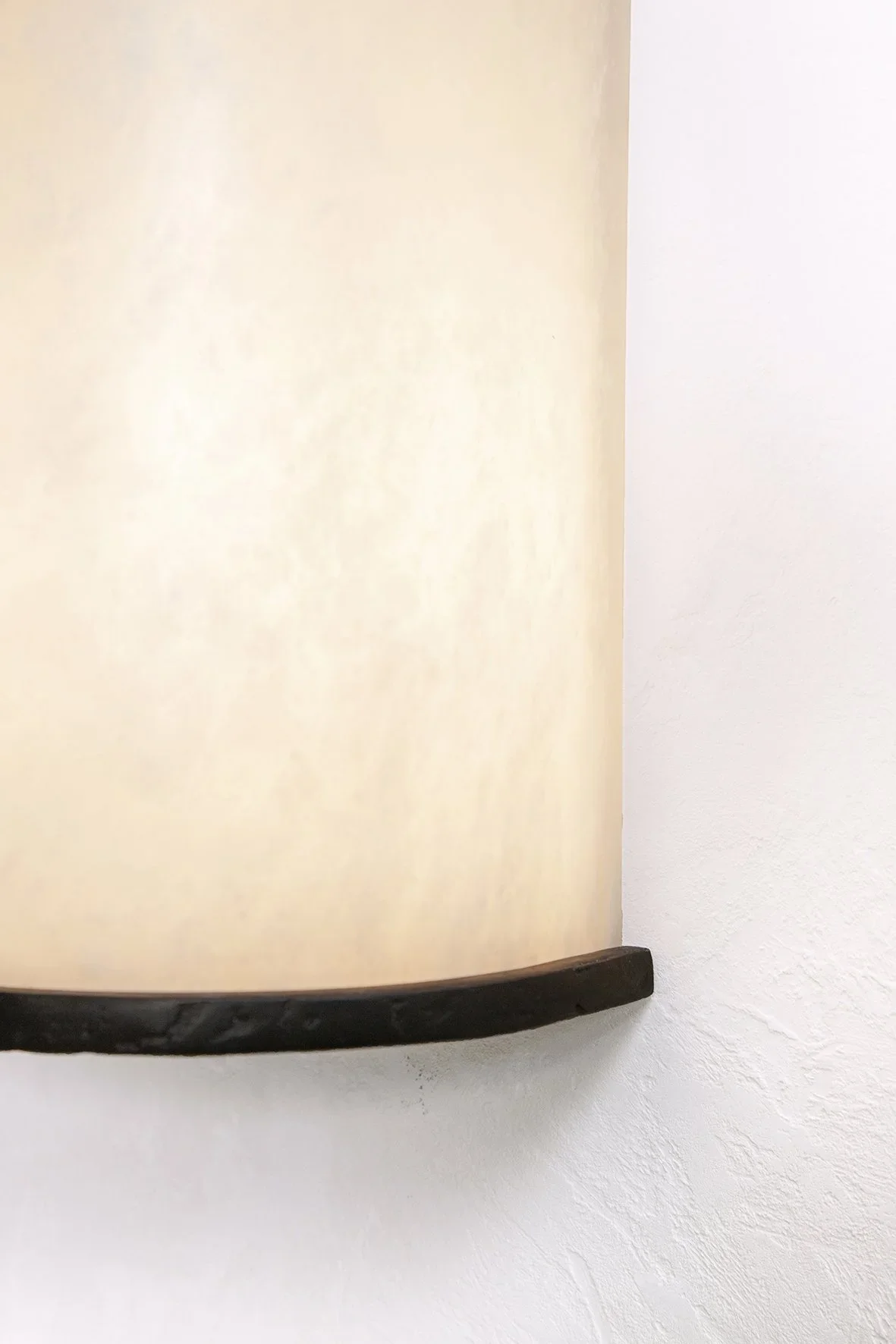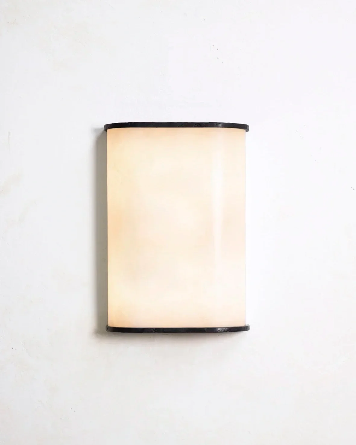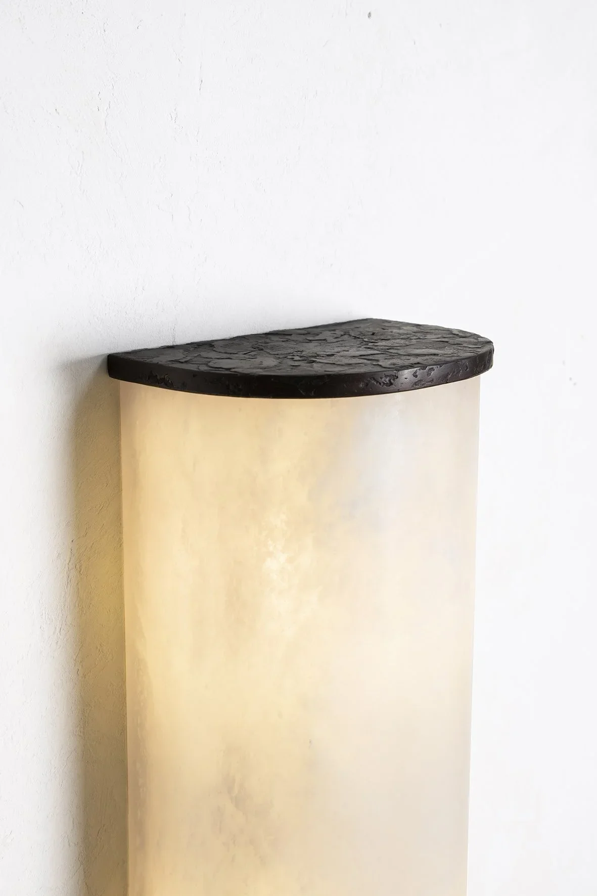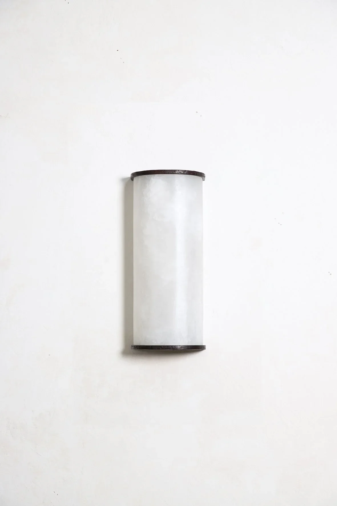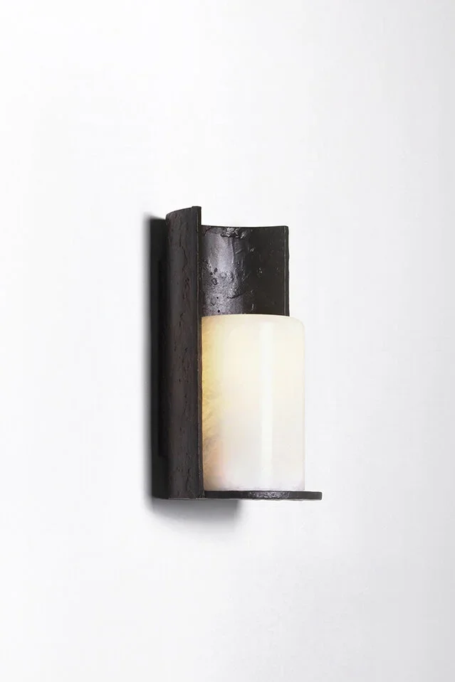 A series of sconces where the alabaster diffuser is held at the top and bottom by lost-wax bronze castings. Available in several sizes.
