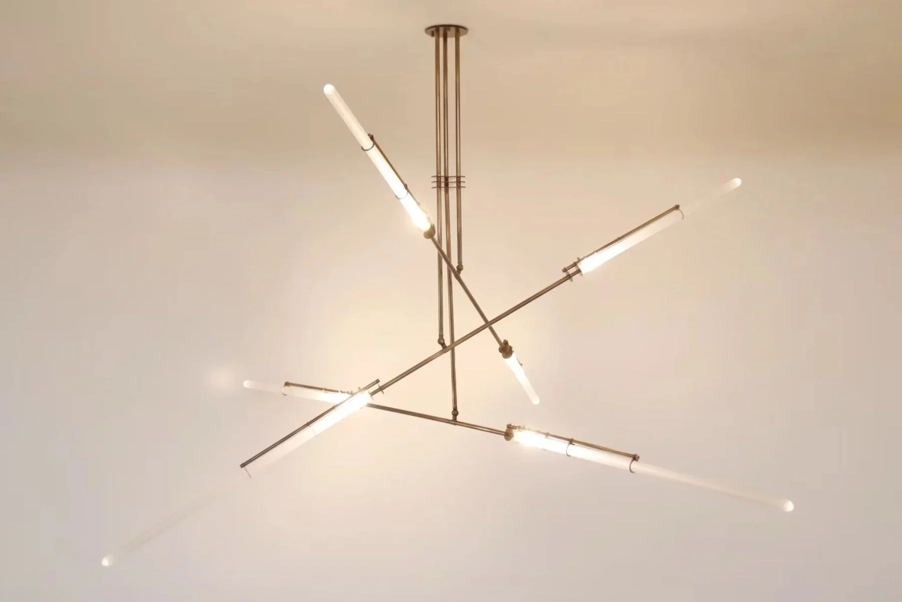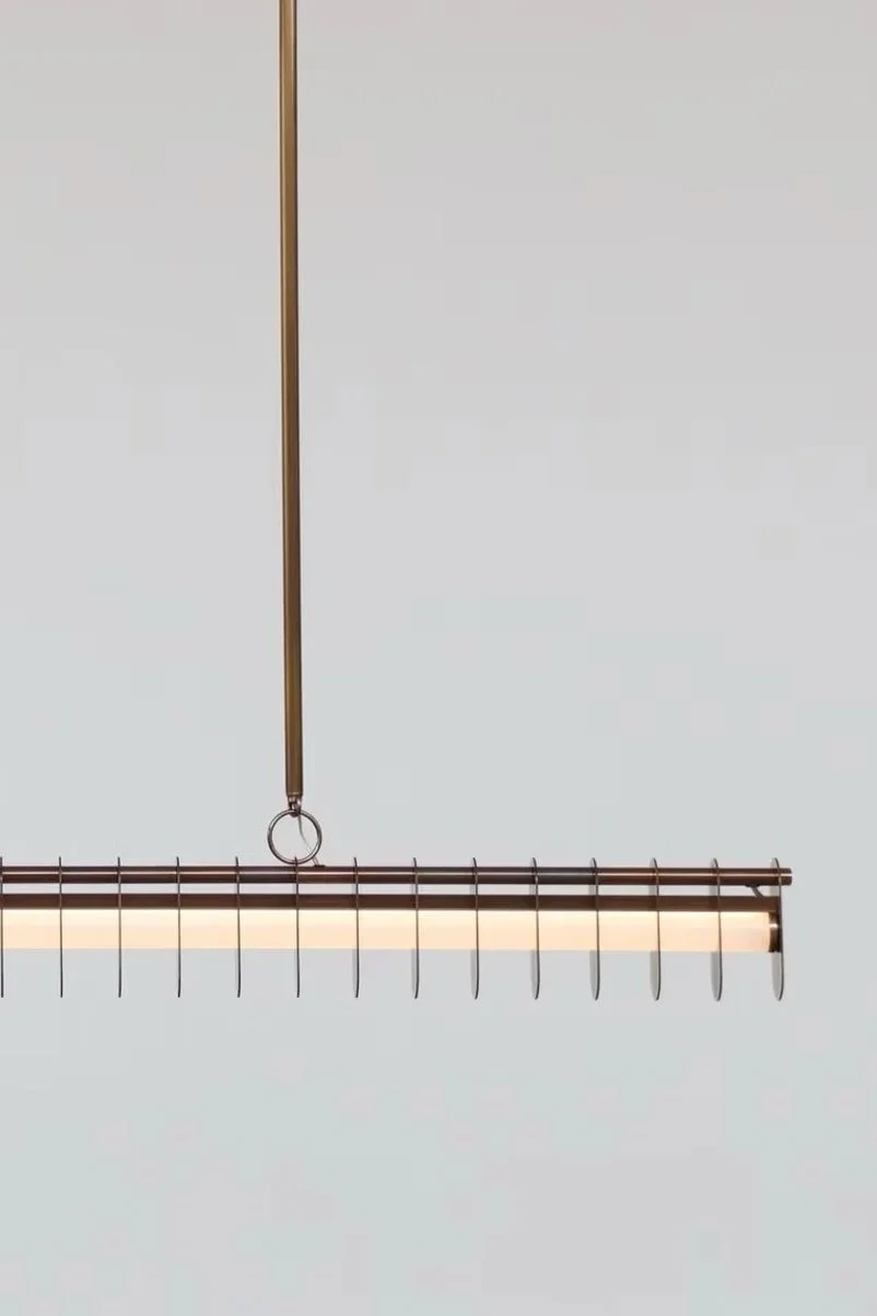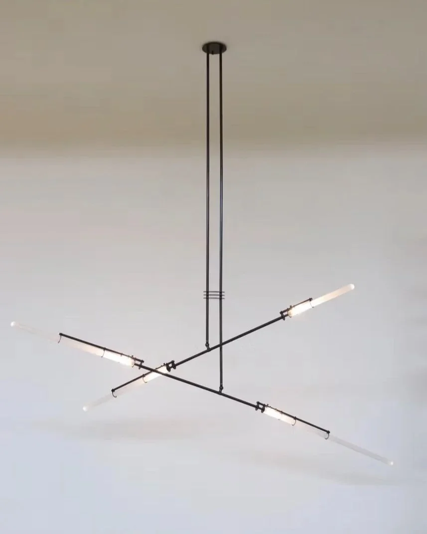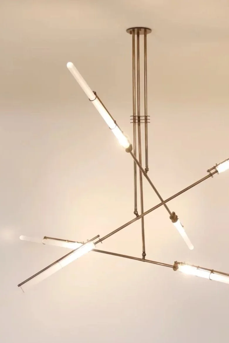 Tubes of frosted glass at varying lengths break free from their brass cages. Pyre is inspired by the exploding sparks of a Blacksmith’s hammer.
