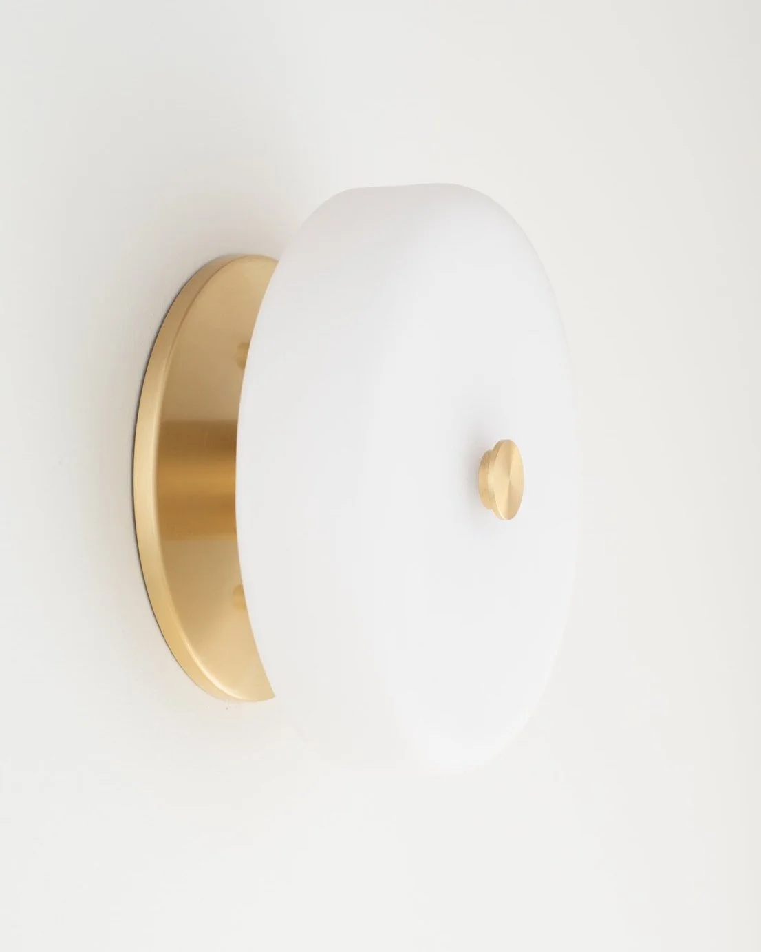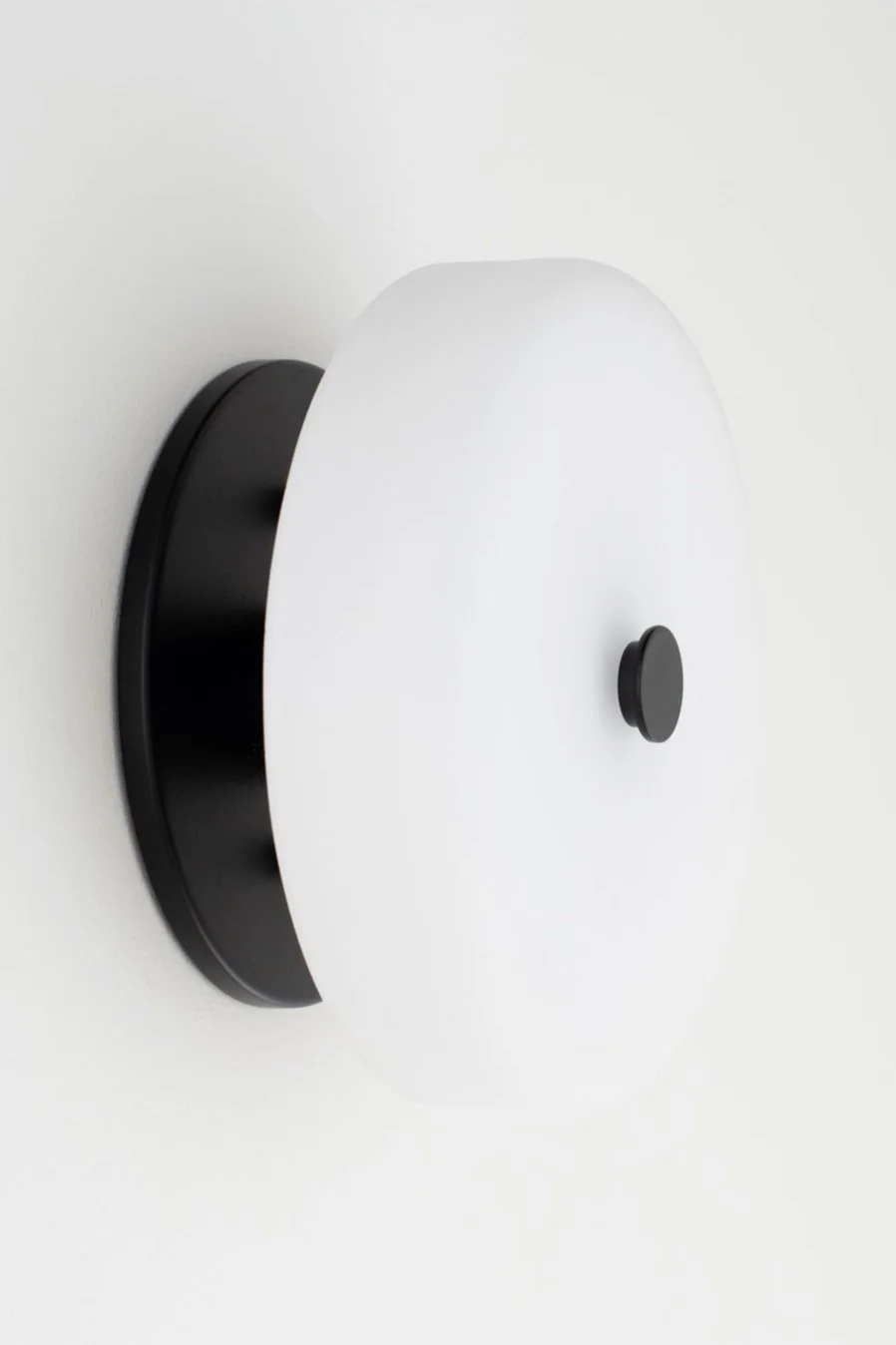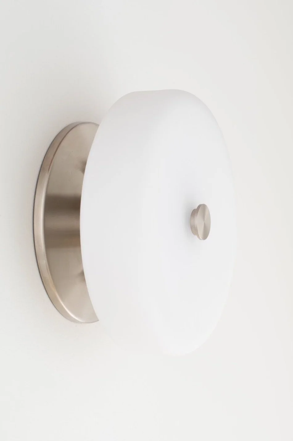 A modern hand-blown glass disc floats effortlessly off the wall providing distinct dimmable illumination.