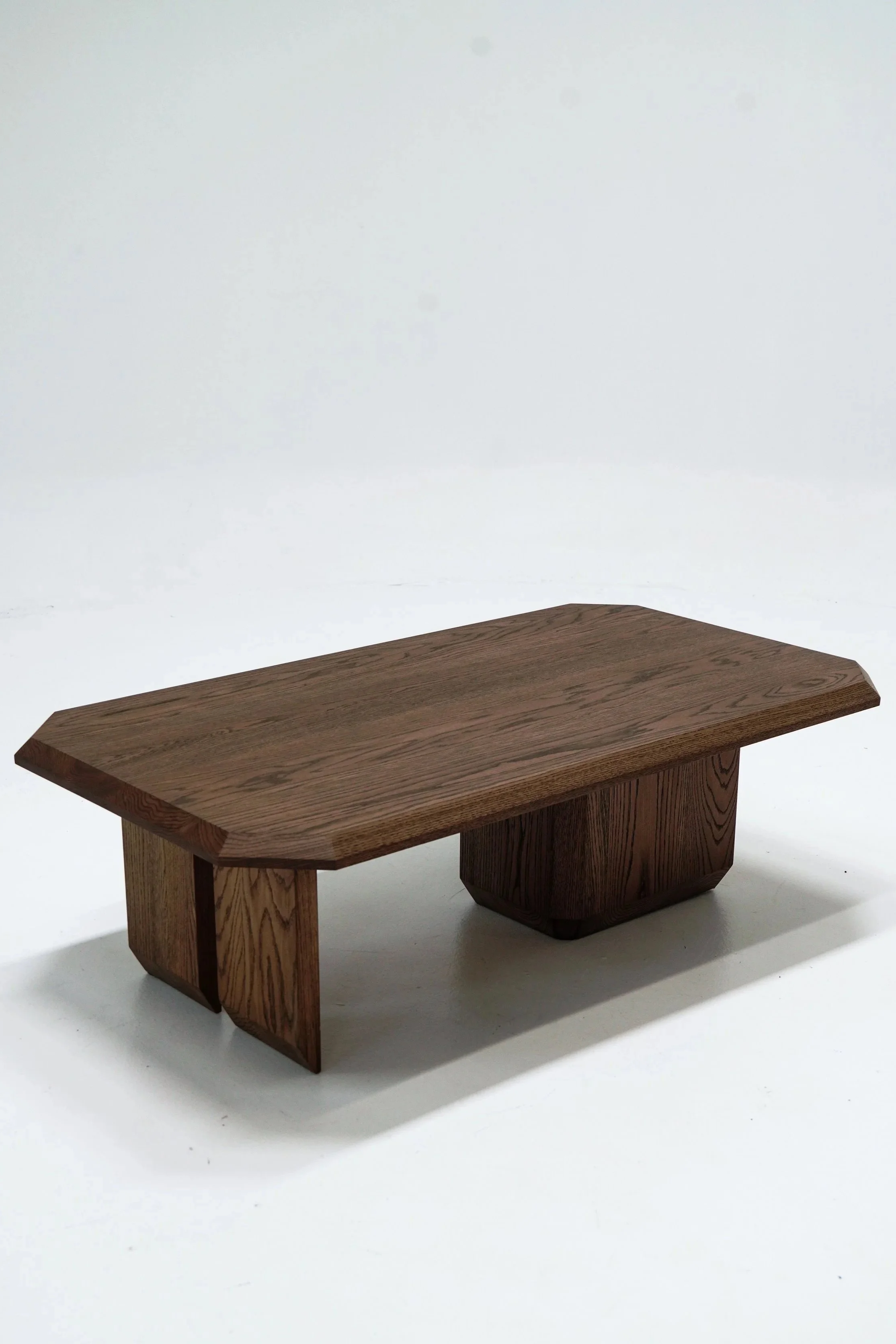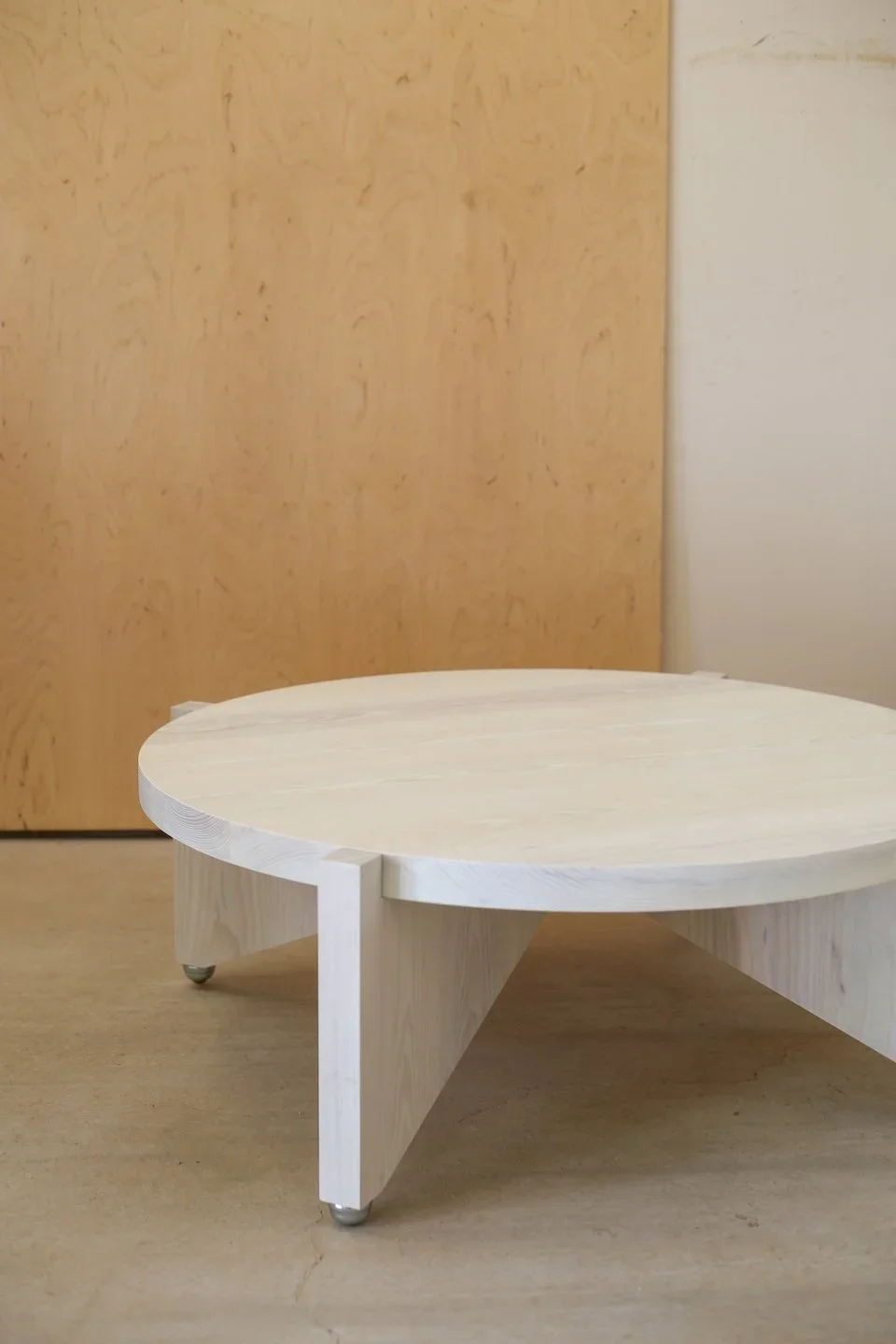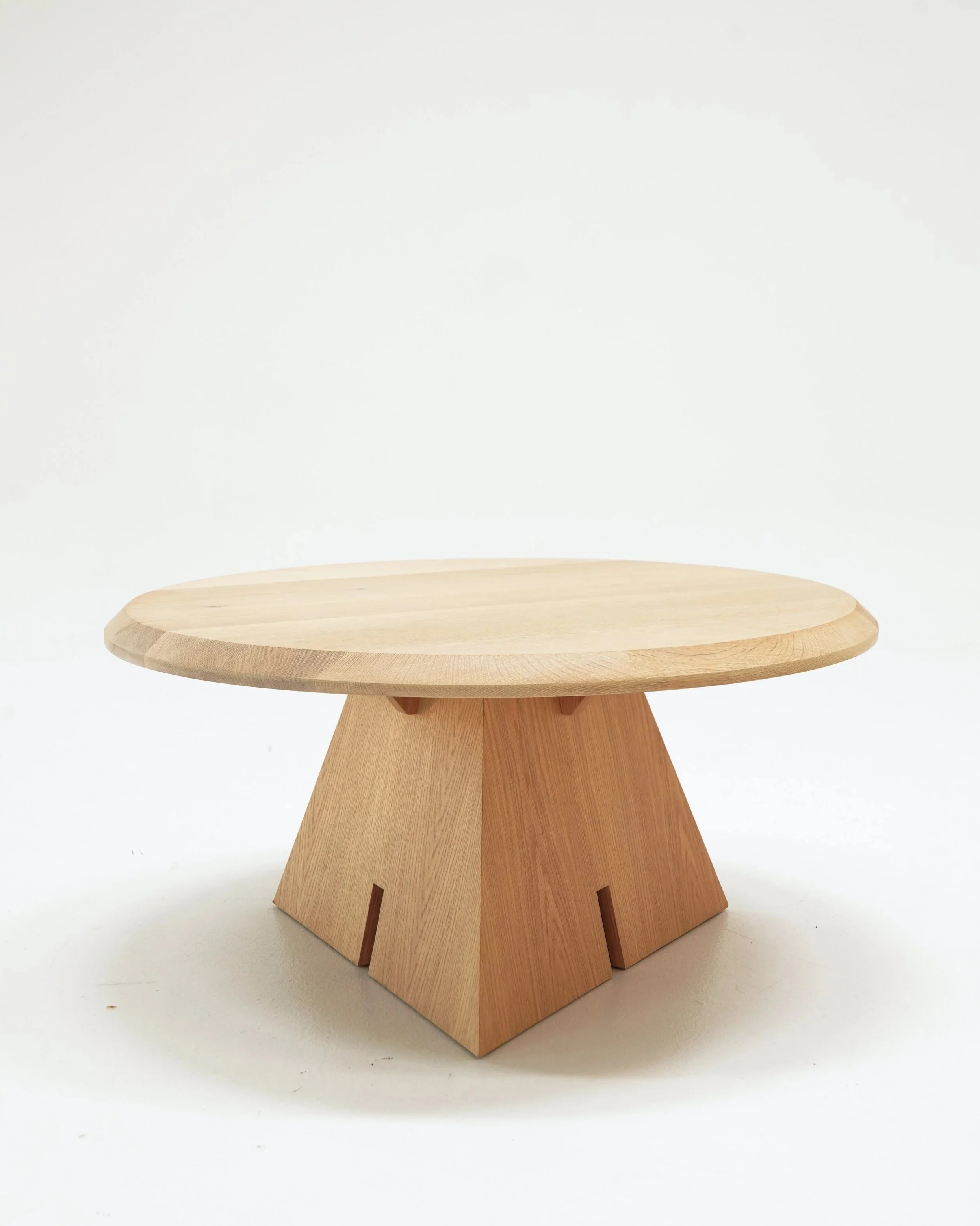 A chamfered round top and triangular base with cropped support show this monumental table’s low ornament, high design. Built and finished by hand in central Texas.