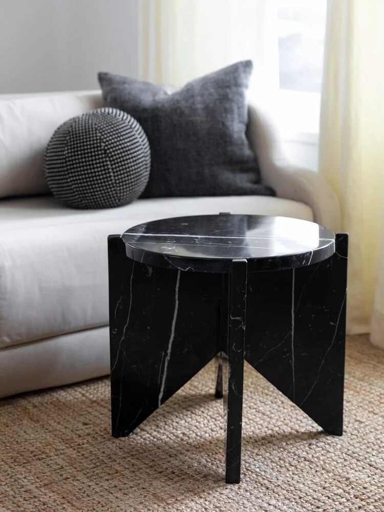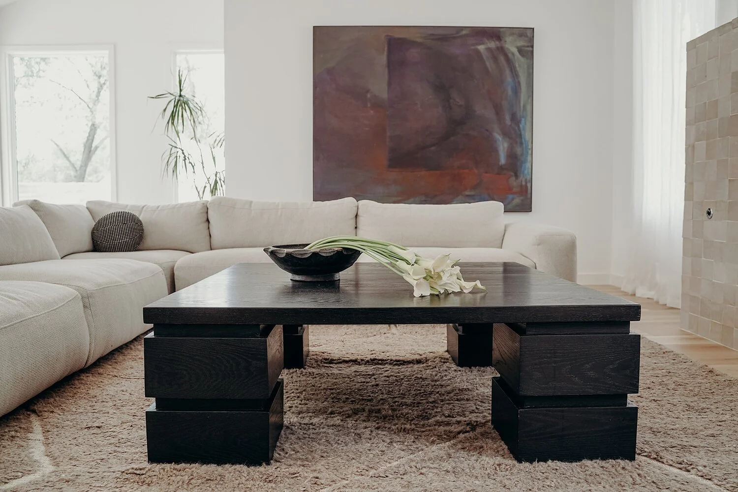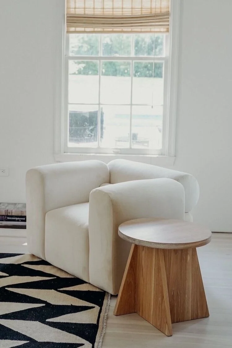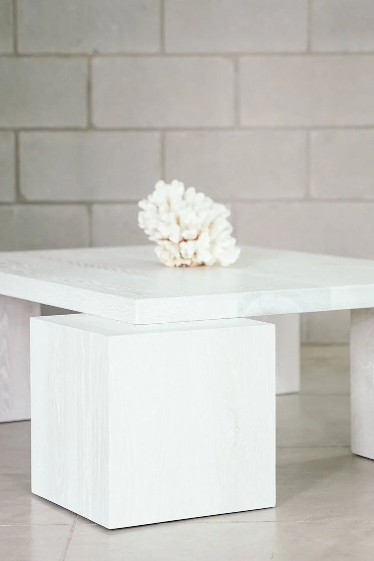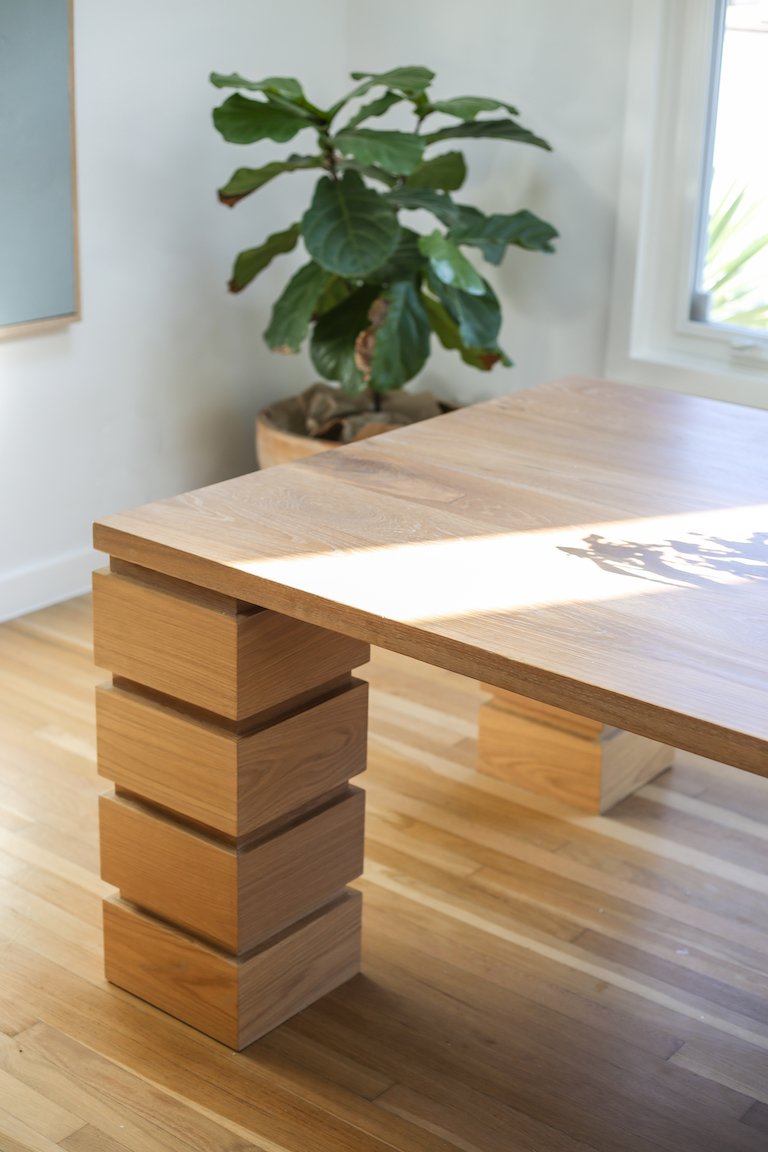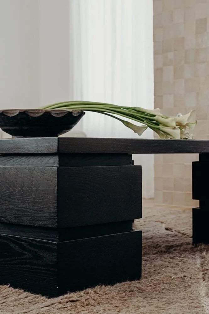 Seemingly minimalist and maximalist at the same time, the stacked faceted oak Maia tables would make a statement in any space.