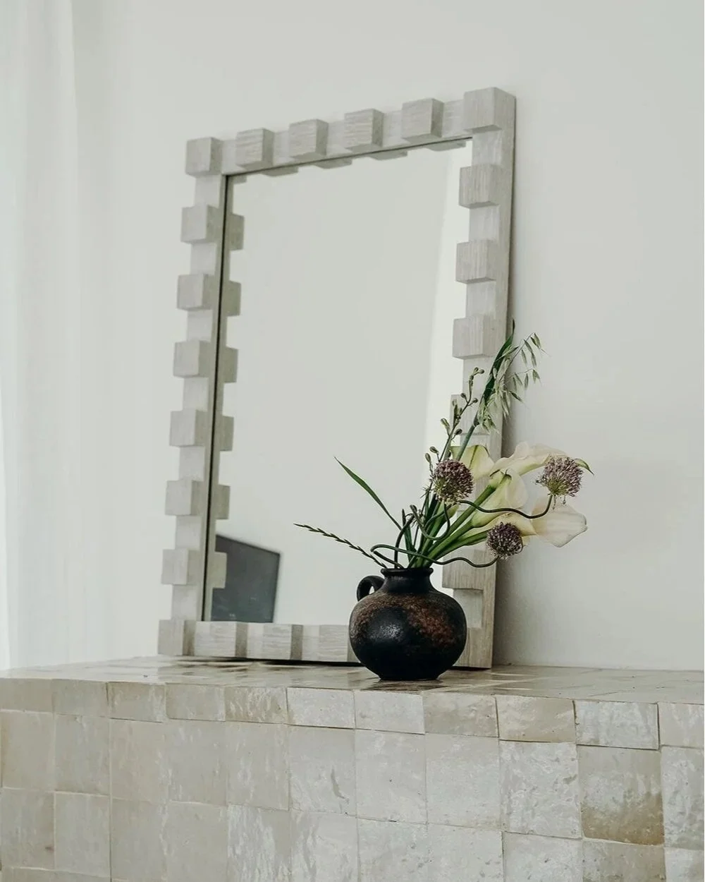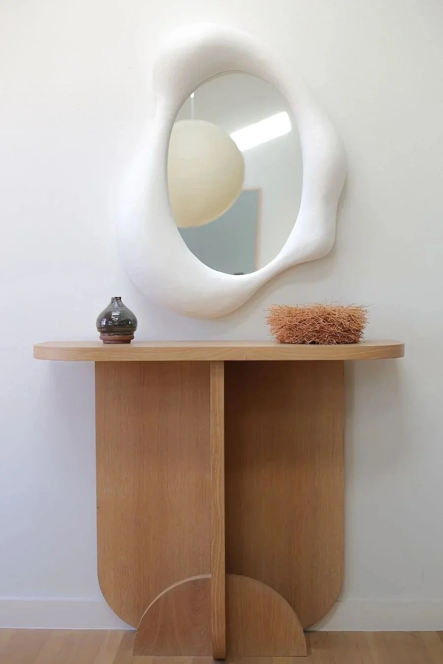 Textural, carved solid wood. Available in round, rectangular or square shapes in white oak or walnut finishes.