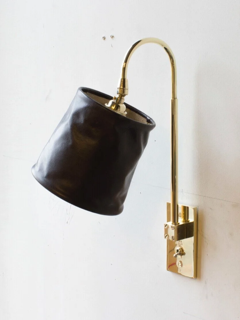 Solid machined brass, hand-dyed waxed leather, hand-dyed braided cotton cord, and pivoting leather shade. The opaque nature of the leather shade creates an overall effect of directed compact or ambient lighting.
