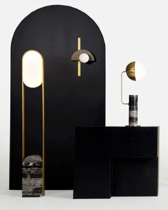Geometric form: quadrants, spheres, cubes and circles. The geometric forms are positioned at the centre and ends of the poles. The pendant is cross shaped and connected by an opaque black sphere at the centre. The light is suspended on adjustable black fabric flexes. The light is crafted from brushed brass, brushed grey metal and opaque glass.