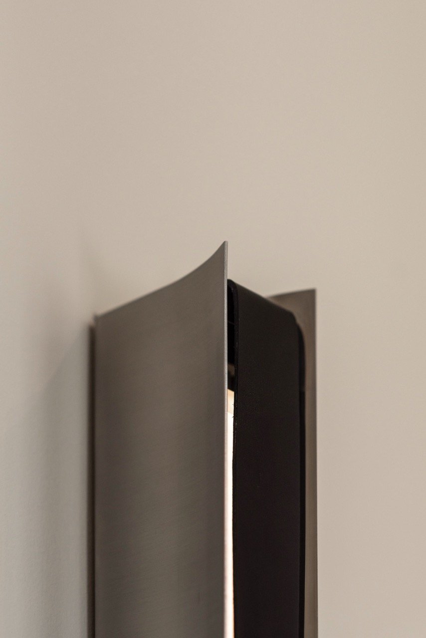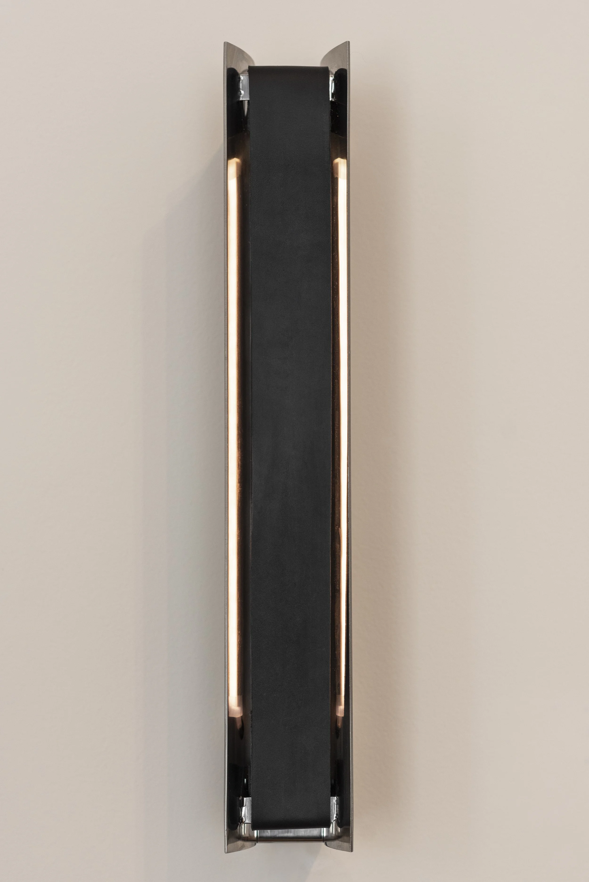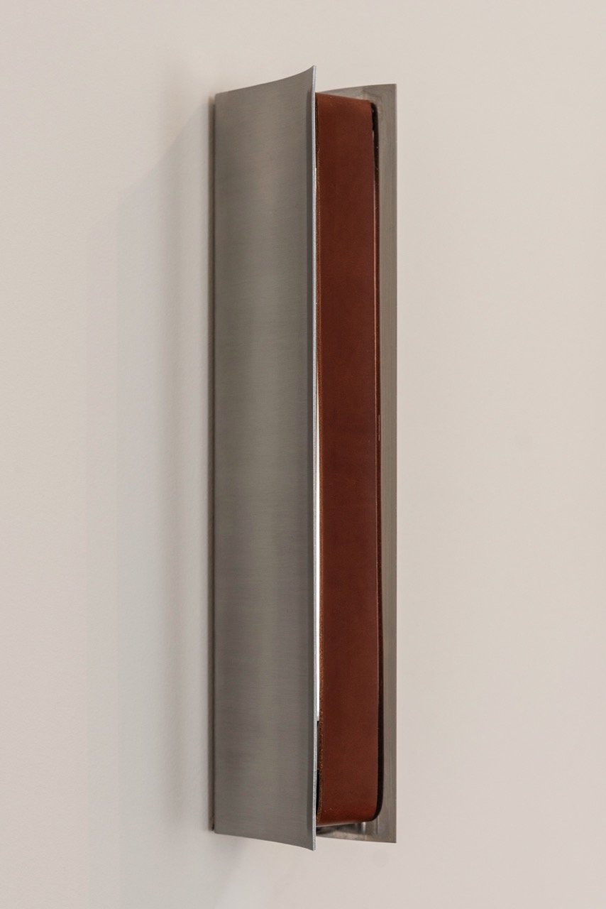A stark and soft presence at once. Their presence can advance or recede throughout the day, yet the Impermanence lights remain structurally anchoring to the space. At night, a fine shimmer of light slips through either side of the leather front, extending the grounding presence of the lamps beyond the confines of their stainless steel walls.