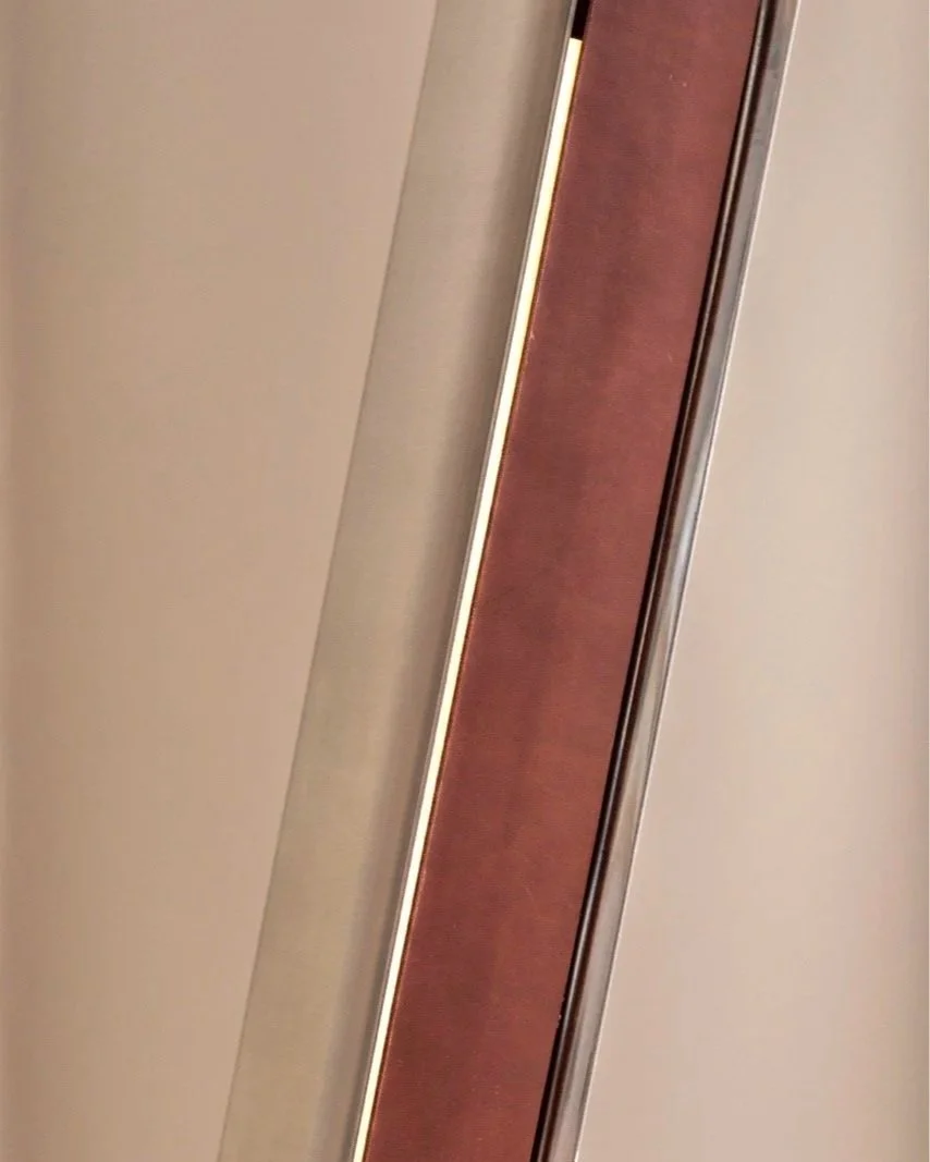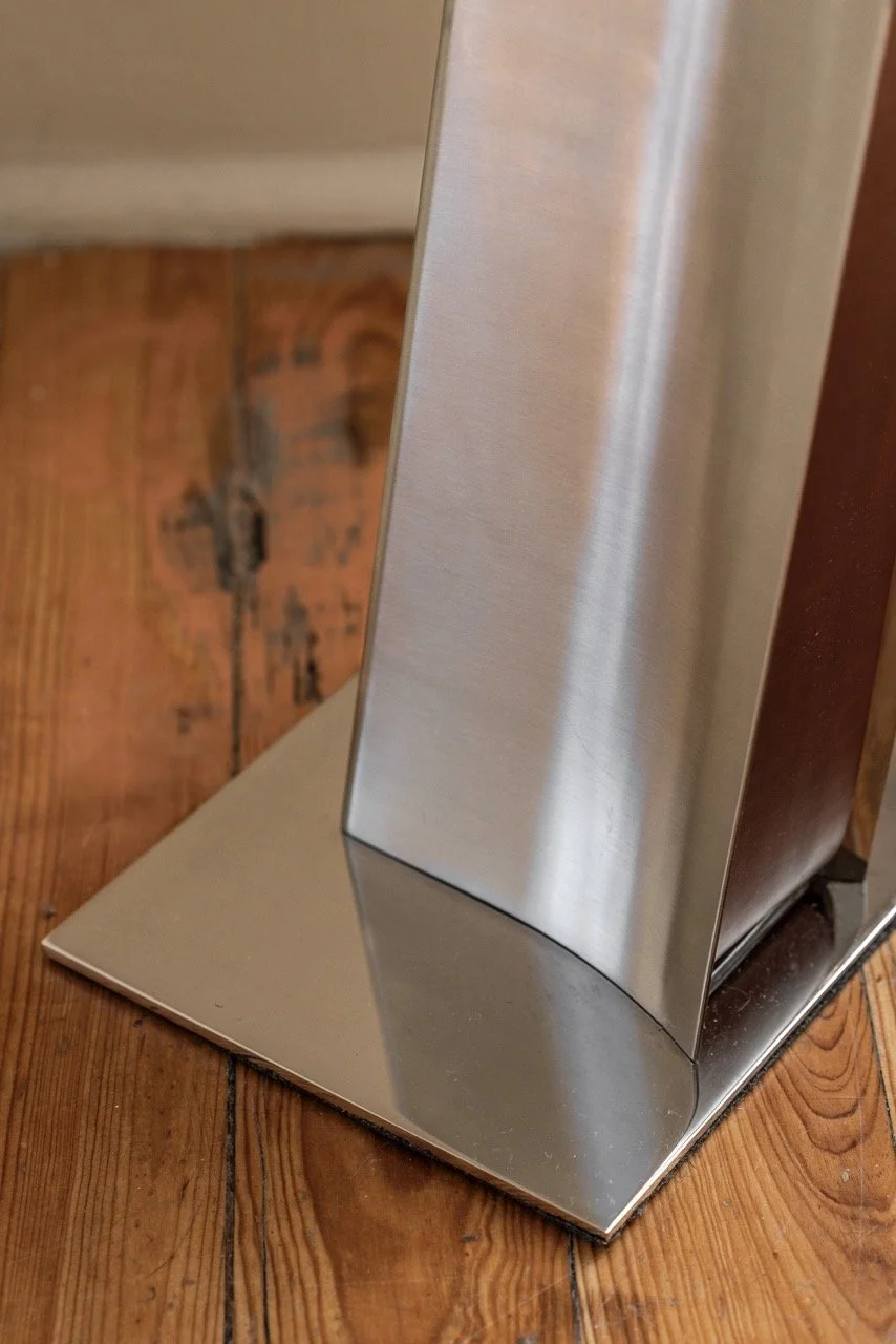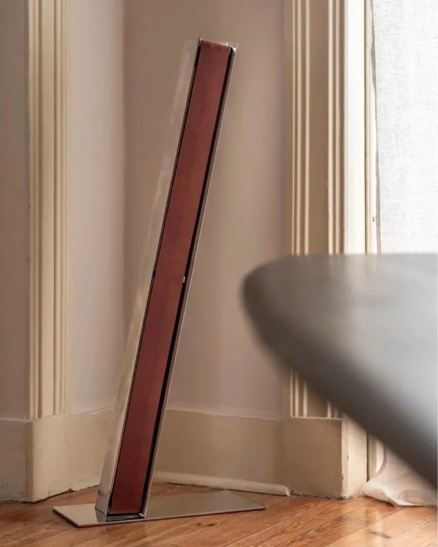 A stark and soft presence at once. Their presence can advance or recede throughout the day, yet the Impermanence lights remain structurally anchoring to the space. At night, a fine shimmer of light slips through either side of the leather front, extending the grounding presence of the lamps beyond the confines of their stainless steel walls.