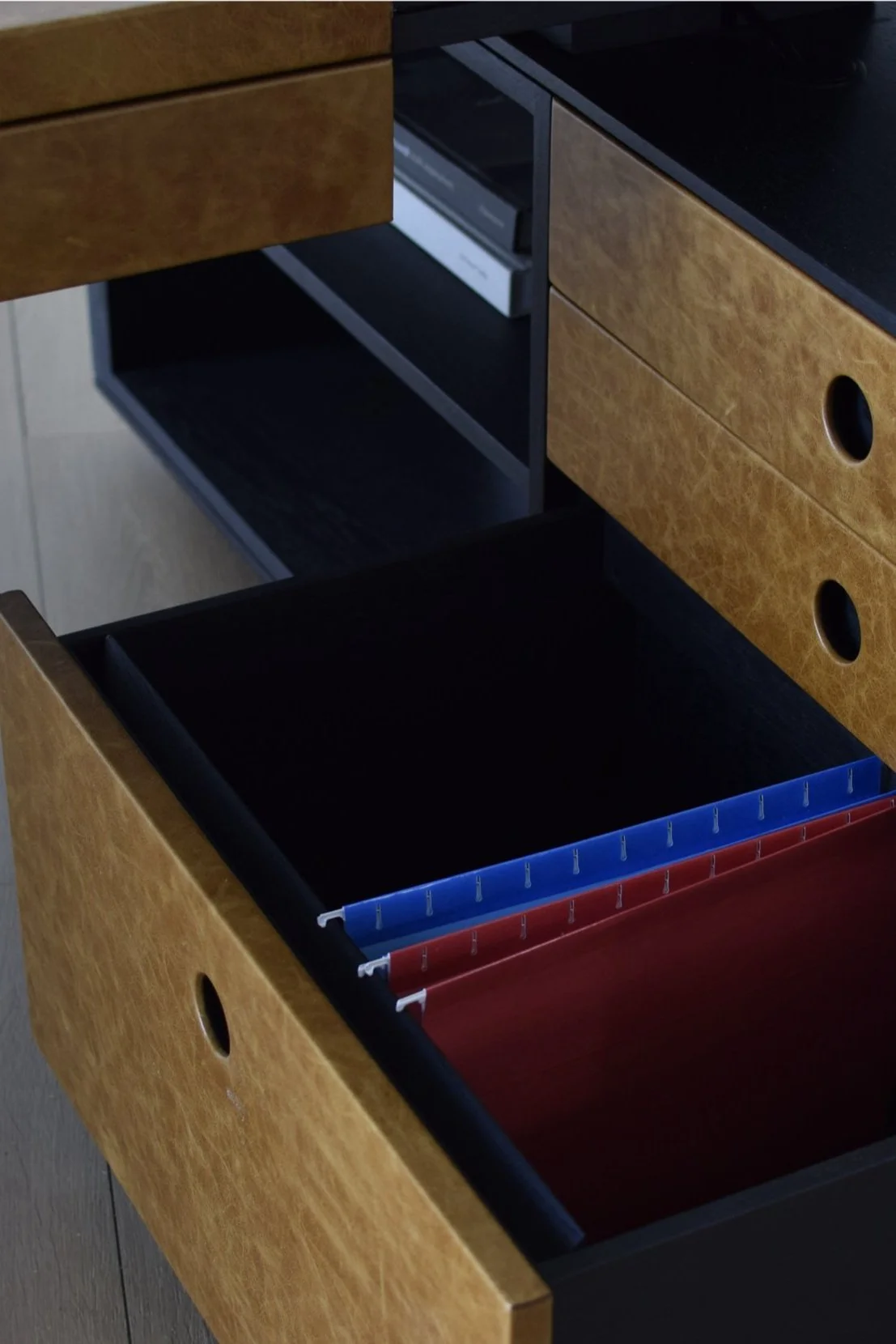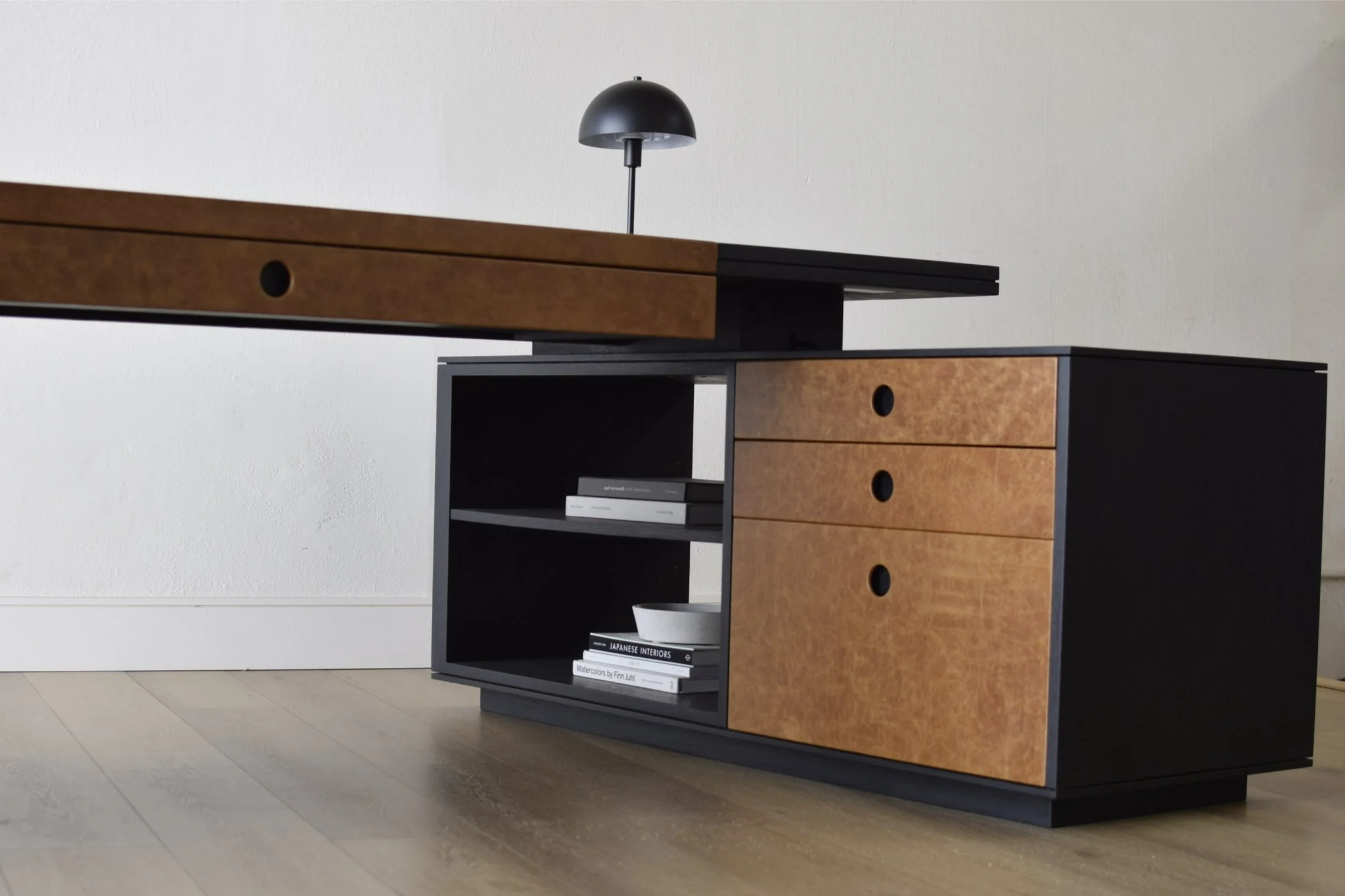 Executive Desk o12, created in collaboration with Studio LoLo, embodies elegance and functionality with its solid hardwood construction and minimal, clean lines. Crafted from fine hardwood, this desk exudes a timeless sophistication. Its integrated leather desk topper and leather-wrapped drawer fronts, complete with round finger pulls, offer a luxurious tactile experience for the user.