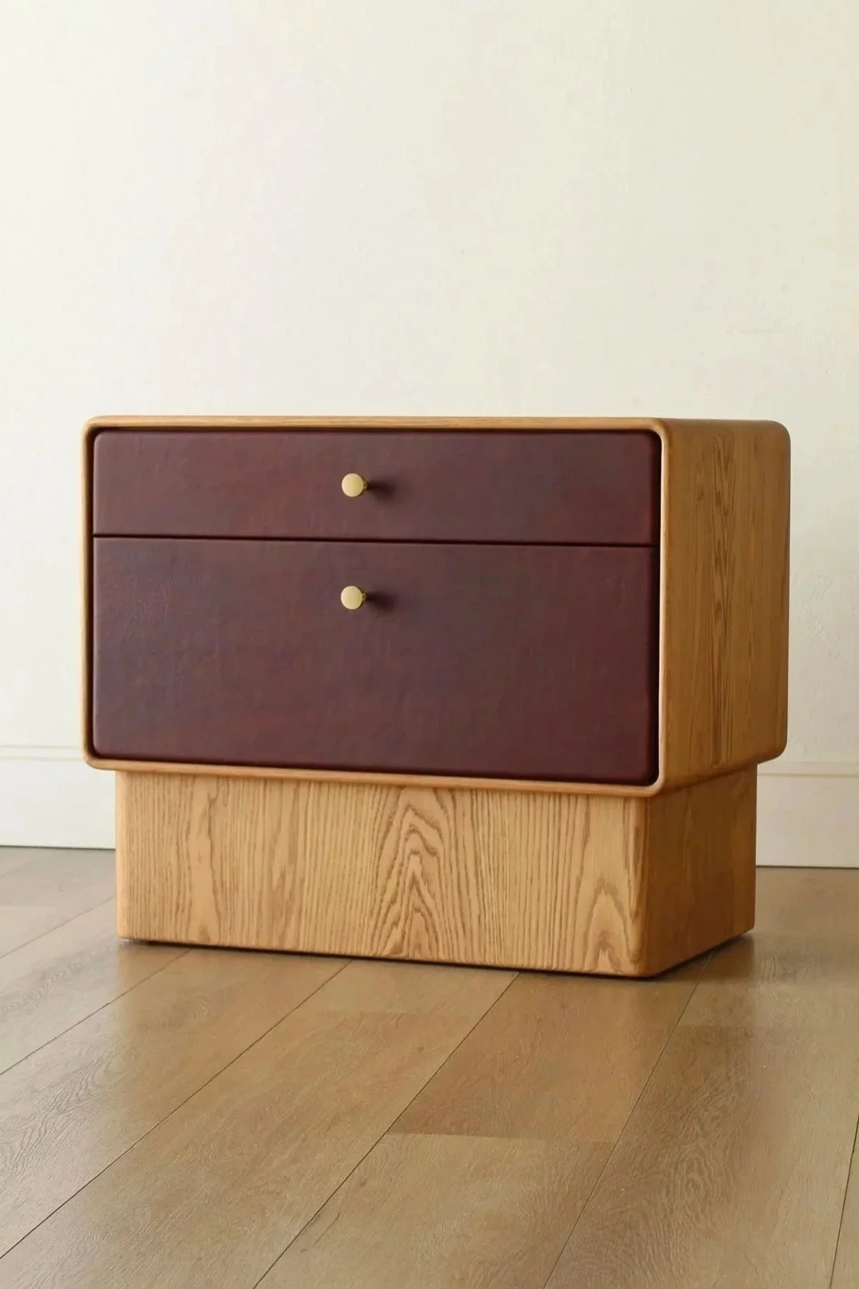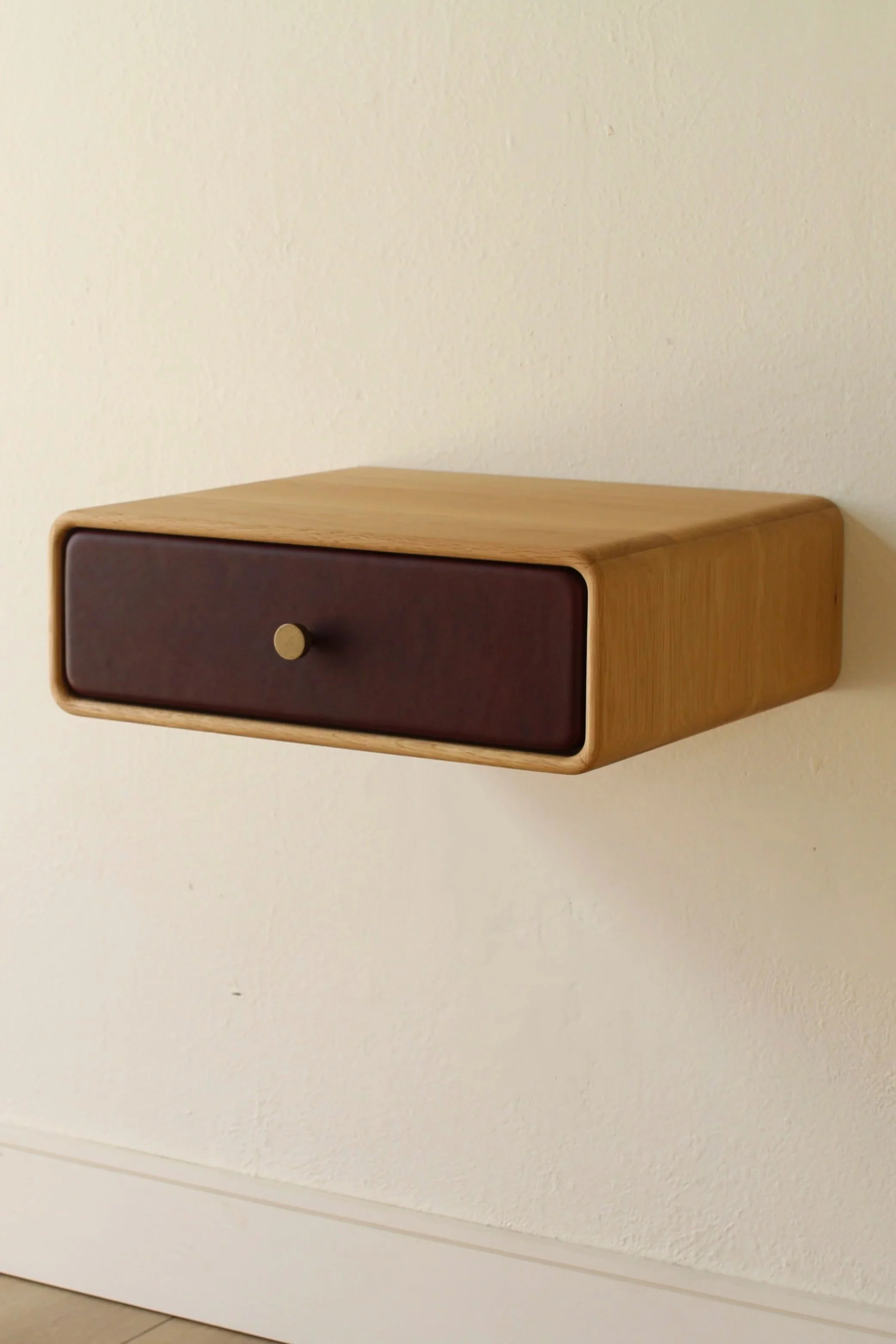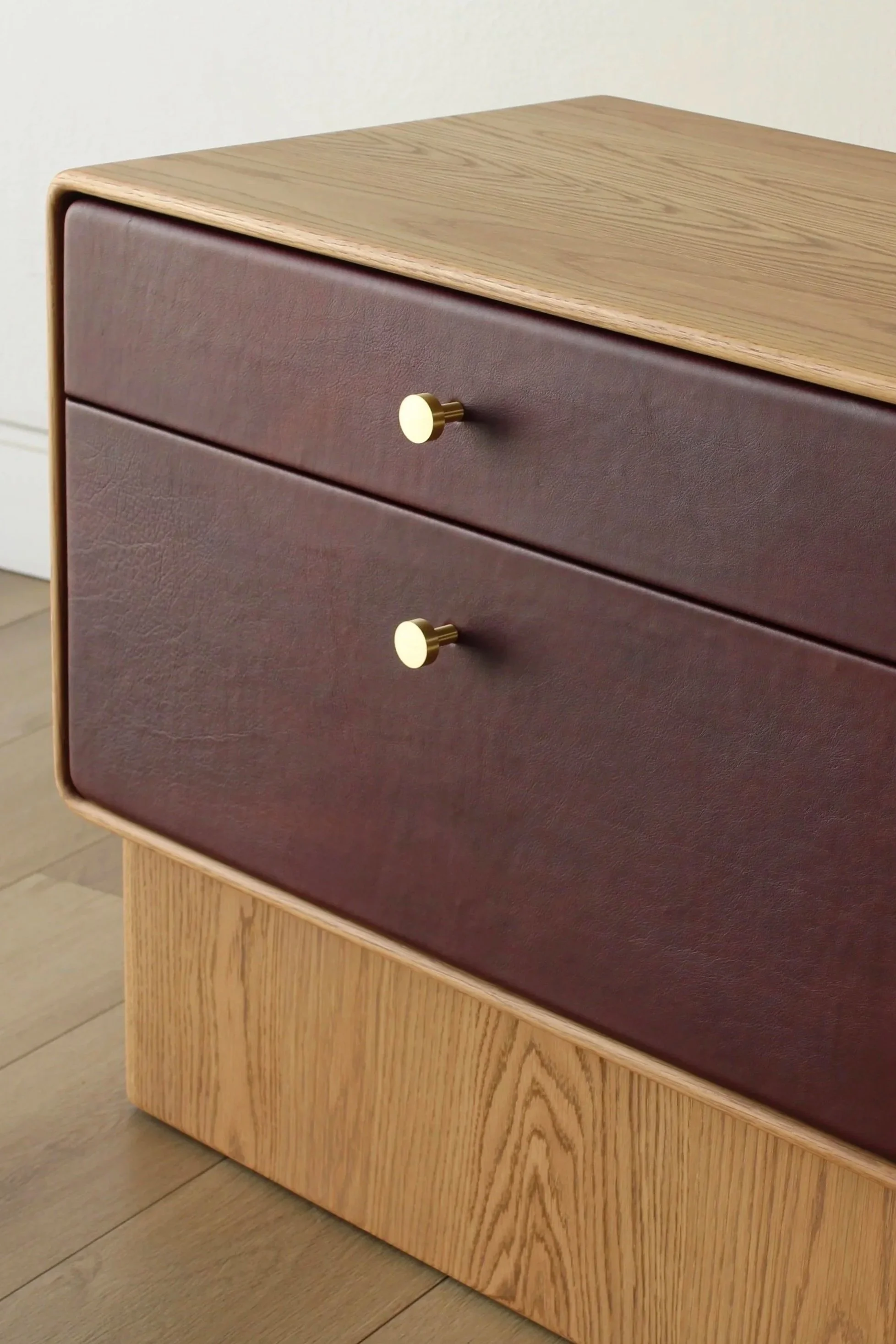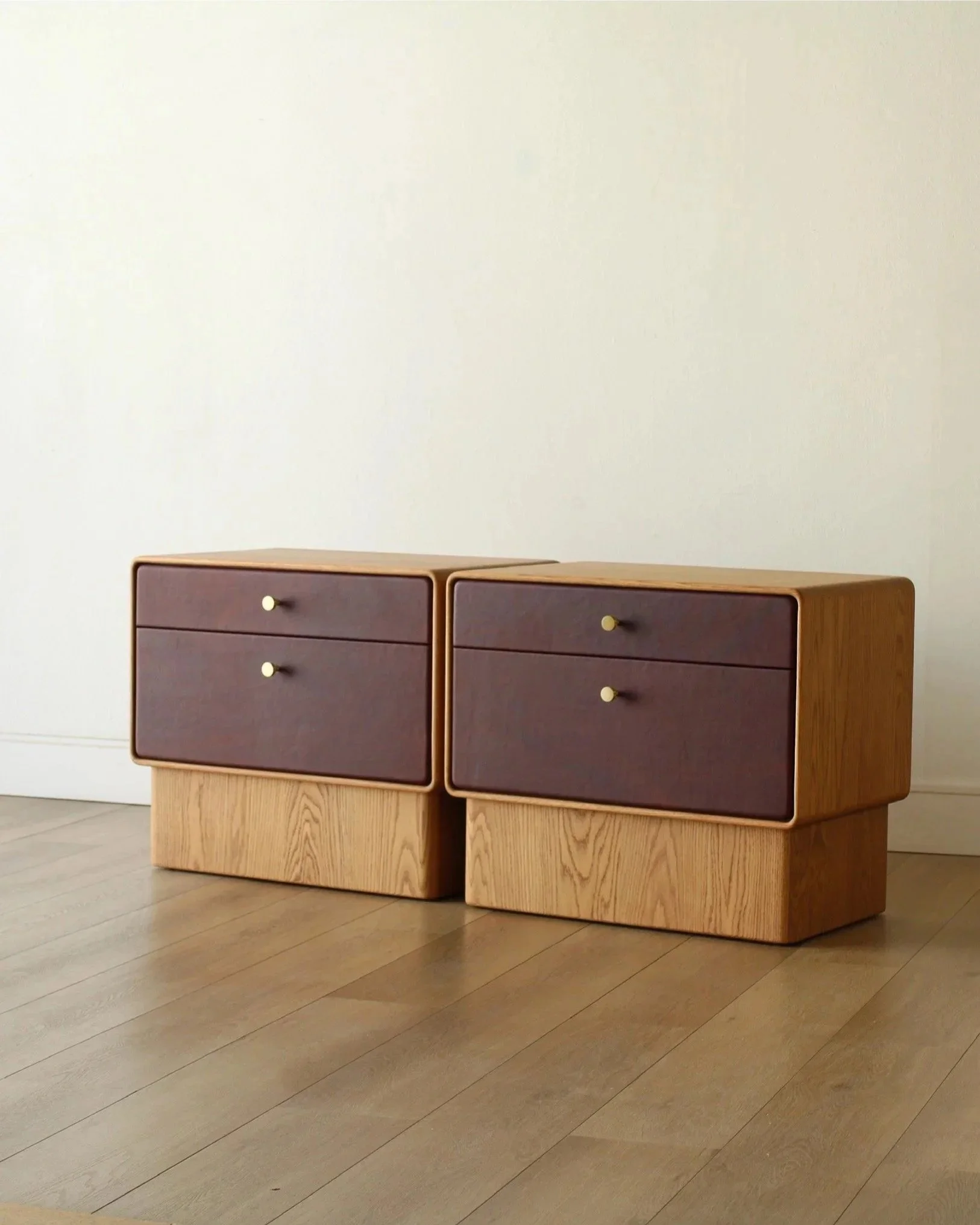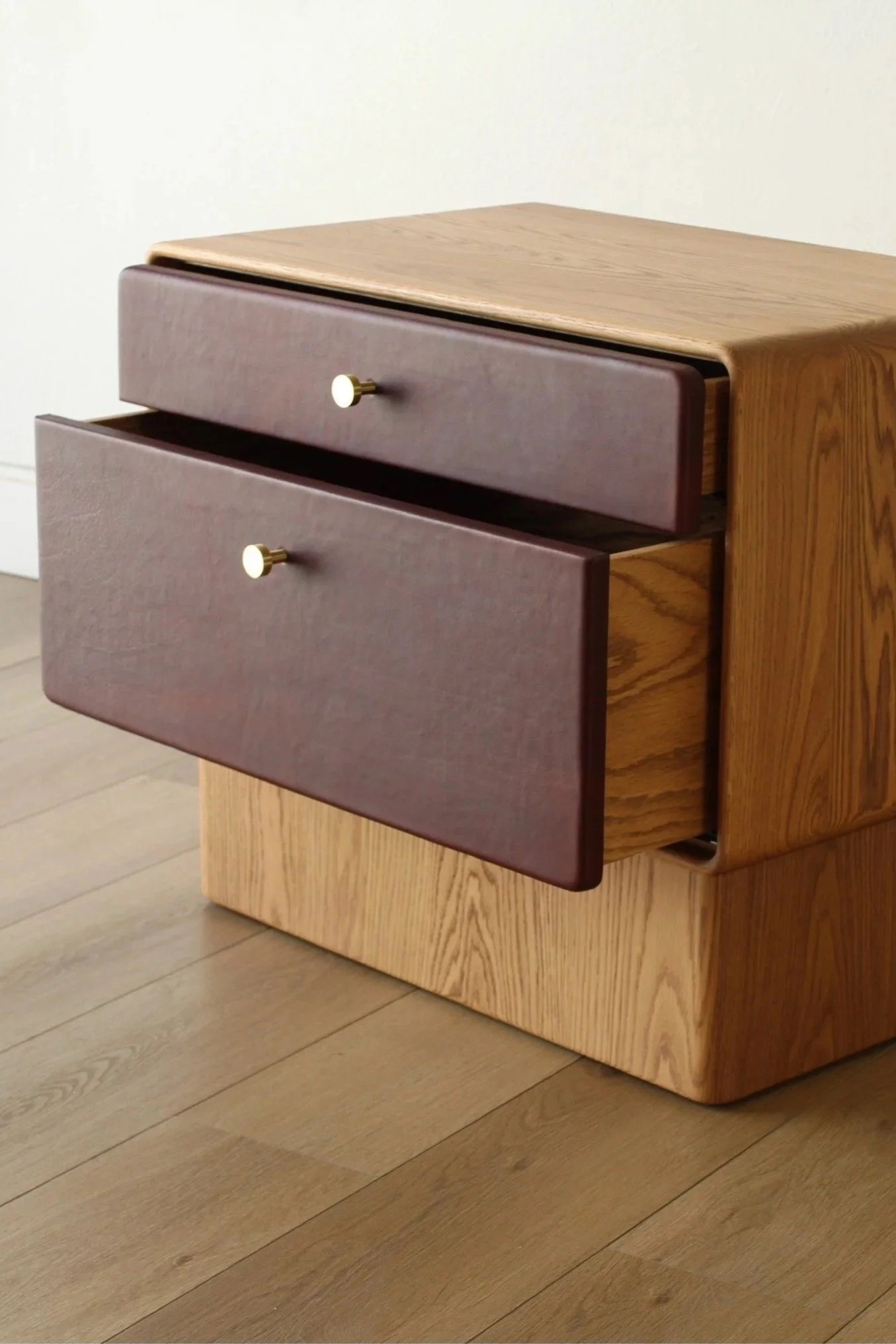 Nightstand o14 embodies a refined minimalist aesthetic with a focus on materiality and proportion. The substantial solid wood base is balanced by drawer fronts wrapped in leather, creating a quiet dialogue between warmth and luxury. A subtle brass pull provides the finishing detail, lending just the right amount of contrast.